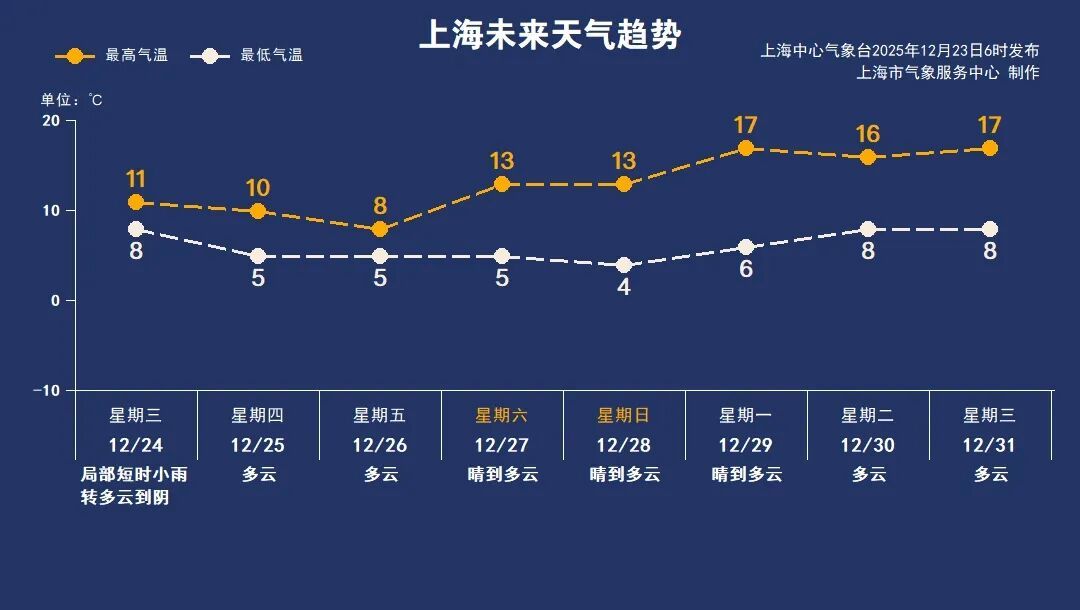 周三早间局部还会飘点雨,影响不大。随着冷空气前锋横扫而过,上午雨止,气温降至8~11℃之间。周四周五气温继续下降,全天气温在10℃以内。双休日以晴或多云天气为主,但回暖有限,预计最高气温在13℃附近。这波冷空气还是有可能将申城带入冬天。下周随着冷空气势力减弱,气温进一步回升。近期气温起伏明显,大家要及时调整着装。