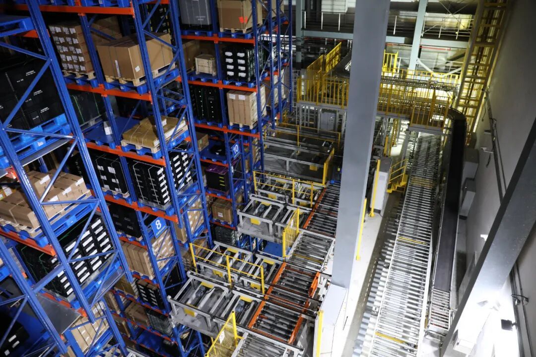 在欧摩威汽车系统(上海)有限公司的“黑灯仓库”内可以看到,堆垛机在接到后台的指令后,凭借智能感应系统在高达20多米的仓库货架内找到对应货物,进行出入库工作。