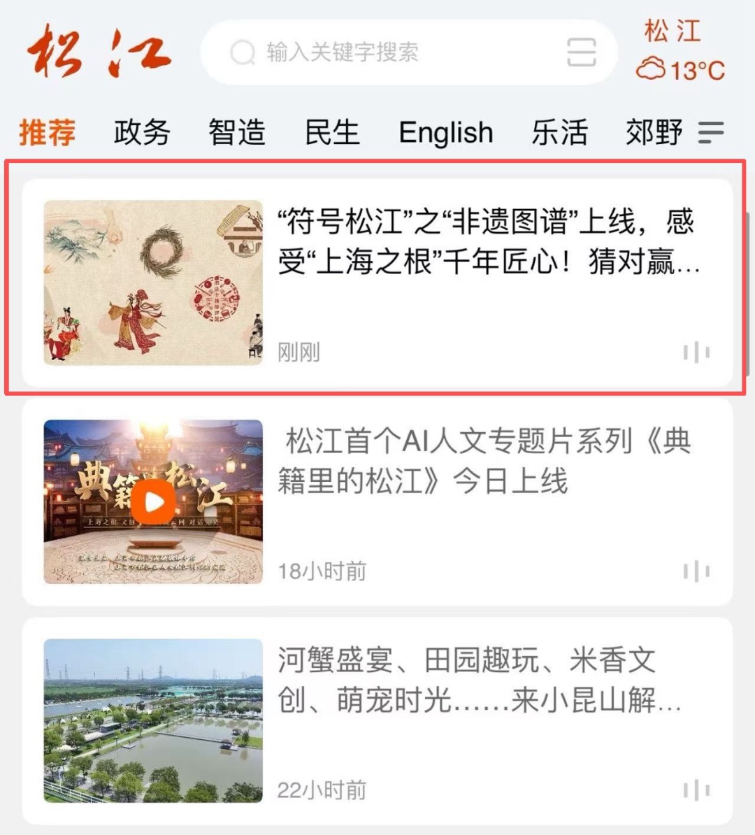 3.在客户端首页“推荐”栏目进入活动文章(见下图),在留言区回复“符号1名称+符号2名称+符号3名称”,前10名同时猜对3个符号的粉丝,将获得“符号松江”专属定制文创!