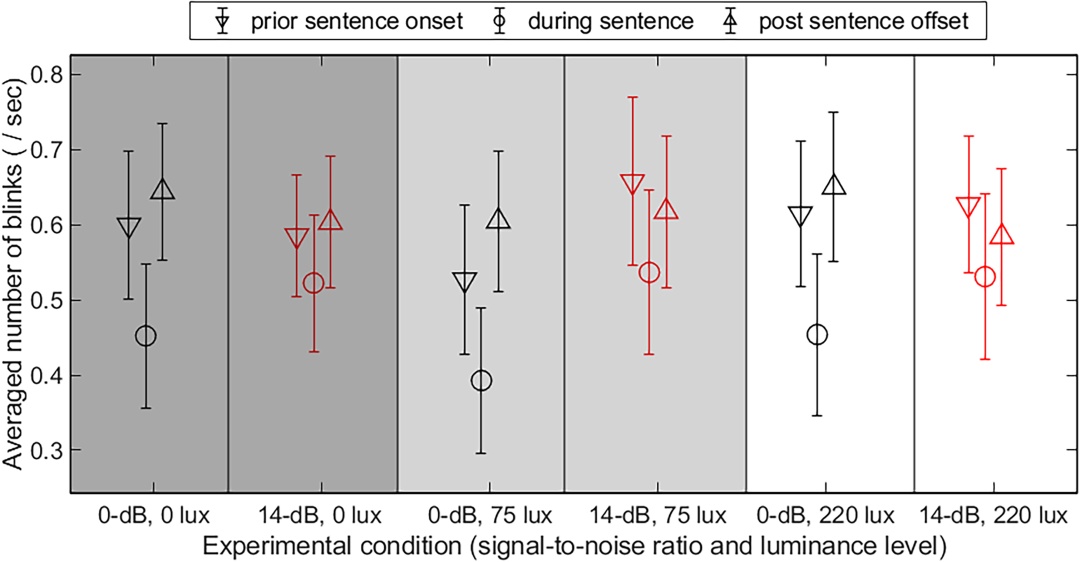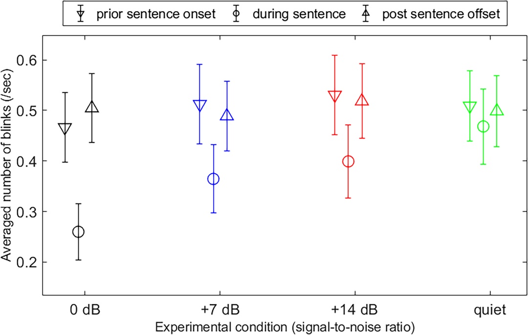 实验结果令人惊讶:句子呈现期间,受试者的眨眼次数显著减少,且信噪比越差(环境越嘈杂),眨眼减少得越明显。比如在0dB信噪比的高嘈杂环境中,眨眼抑制效应远高于安静环境。