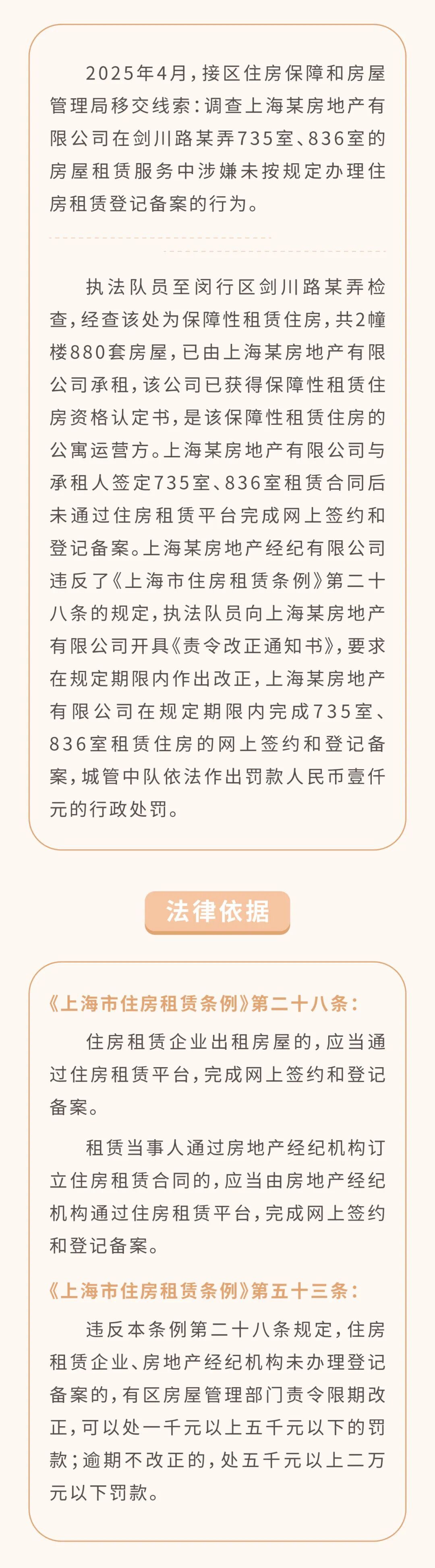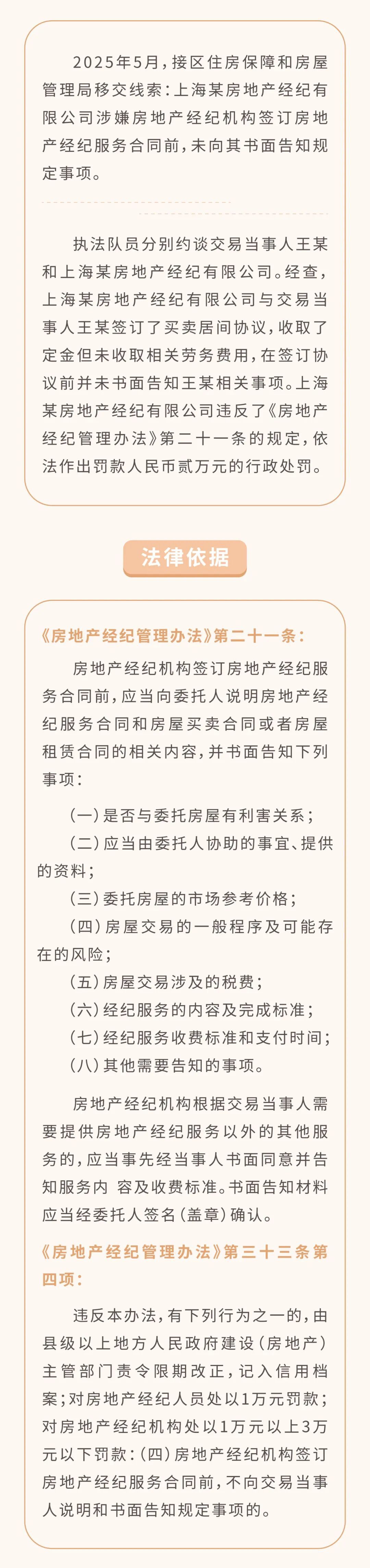 在房屋买卖、租赁的过程中,房地产经纪机构不仅承担着促成交易的职责,更负有向交易当事人清晰传达信息、依法完成备案程序等法律义务。但在实际经营中,仍有部分机构因疏忽或逃避责任,未能履行法定的告知与备案义务,最终面临行政处罚。 区城管执法局近日通报三则典型案例,清晰地展现了房地产经纪机构在执业过程中因未尽职责所承担的法律后果,也借此提醒市民注意房地产交易中的规范与风险。 “签约告知”是诚信之本 “备案登记”是法定义务 “持证经营”是基本底线 据区城管执法局介绍,对于房地产经纪行业而言,合法、规范、透明不仅是市场要求,更是法律红线。任何在告知、备案环节的缺失或延迟,都可能带来信誉损伤与经济处罚。市民也应擦亮眼睛,选择正规房地产经纪机构,严格审查合同条款,保障自己的合法权益。