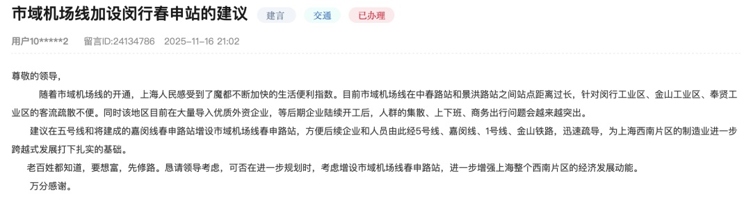 近日有网友在人民网“领导留言板”留言称上海市域机场线在中春路站和景洪路站之间的站点距离过长希望增设市域机场线春申路站进一步增强涉及闵行、金山、奉贤在内的上海西南片区经济发展动能