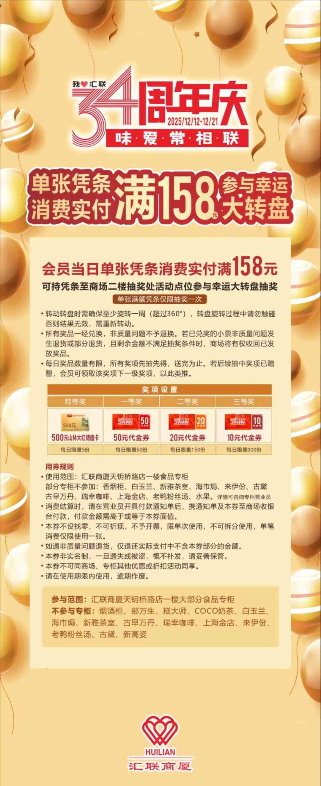 满额抽“金豆”,新年好彩头!元旦(2026年1月1日至2日)及春节期间,在港汇恒隆、美罗城、汇金百货(徐汇店)、汇联商厦、飞洲国际等商场消费满额,即有机会抽取寓意财富的“品牌金豆”、丰盛“新春年夜饭”套餐及各类精美礼盒。把实实在在的福气带回家!