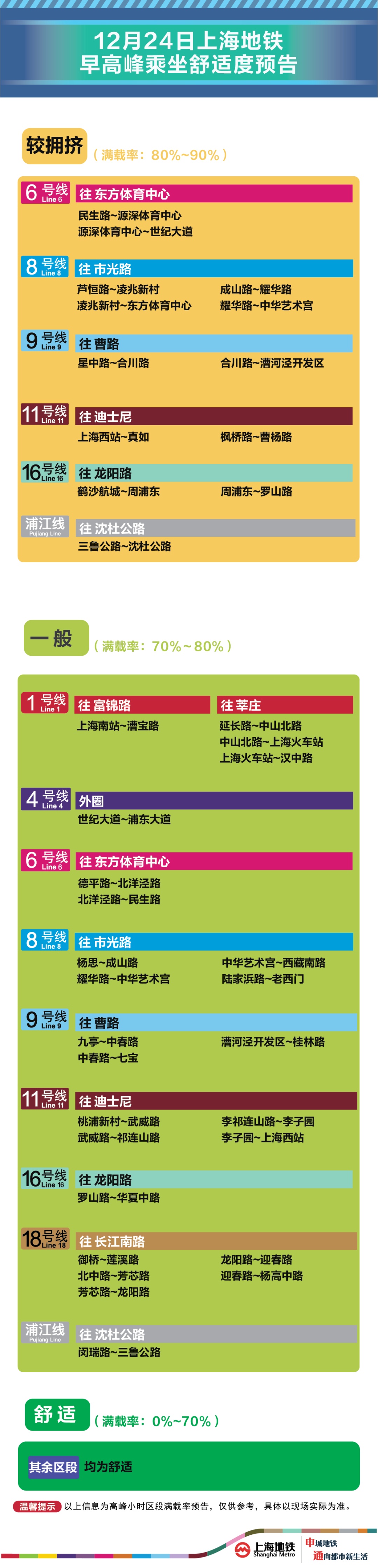 为提升上海地铁早高峰期间出行服务水平,提升乘客乘坐体验,上海地铁向乘客提供乘坐舒适度预告,方便乘客提