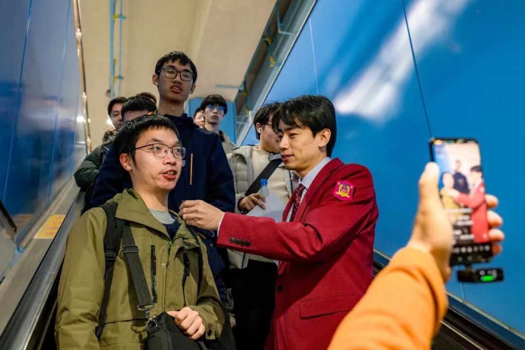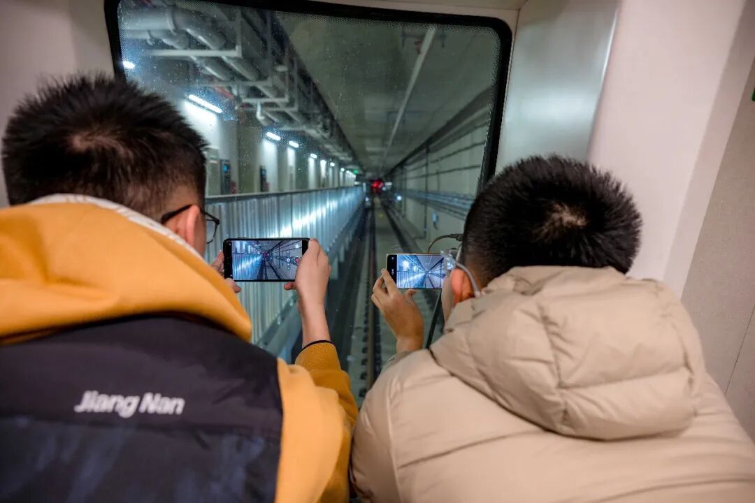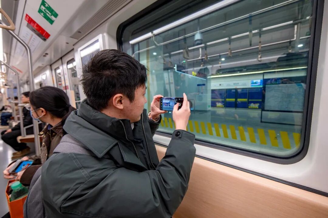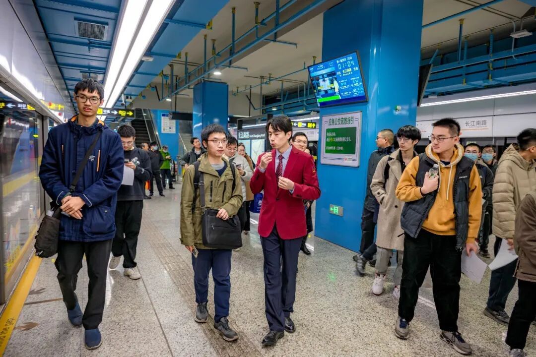 在工作人员的引导下,“铁丝” 们依次探访了康文路站、呼兰路站、长江西路站及通南路站四大特色站点。建设设计团队现场揭秘了18号线二期的硬核亮点:从运用中国传统榫卯工艺原理的预埋承插式管片隧道,到误差控制在±0.5mm内的高铁级智能精调轨道;从呼兰路站 “通道+天桥” 式的新老线路无缝换乘设计,到各站 “一站一墙一景” 的艺术装修理念,每一处细节都彰显着 “以人为本” 的建造初心。长江西路站的薰衣草色治愈空间、康文路站的天光蓝色开阔意境,让 “铁丝” 们不时驻足拍照,沉浸式感受工业记忆与现代美学的碰撞。
