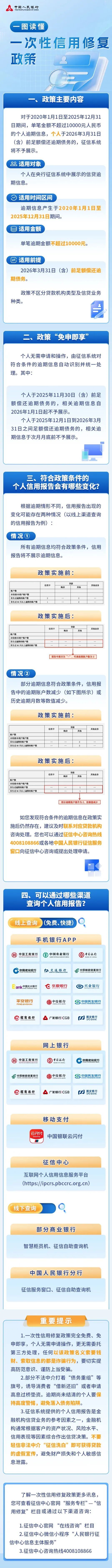 为支持信用受损但积极还款的个人高效便捷重塑信用,助力经济持续向好,中国人民银行发布《中国人民银行关于实施一次性信用修复政策有关安排的通知》,明确央行征信系统(金融信用信息基础数据库)对符合条件的个人逾期信息作不予展示处理。详见↓