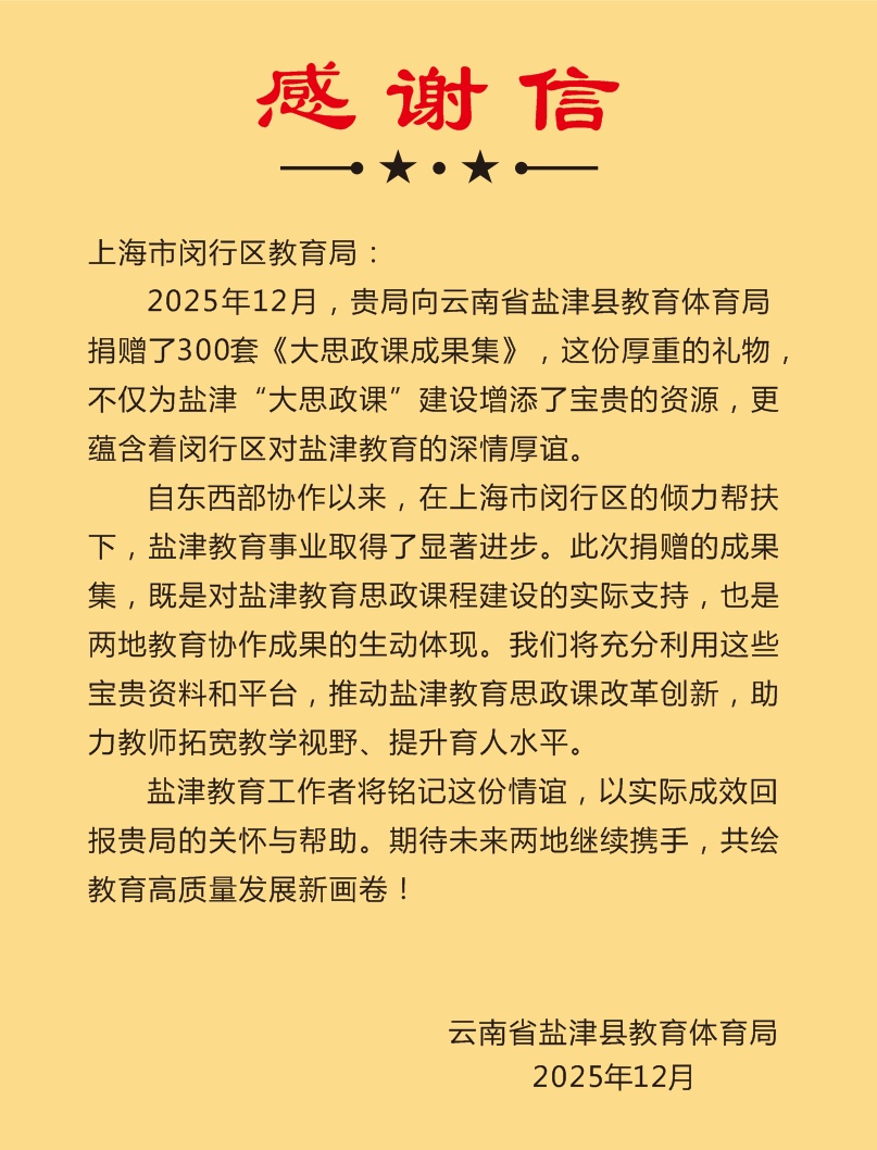 12月22日,闵行区教育局收到来自云南省盐津县教体局发来的一份感谢信: