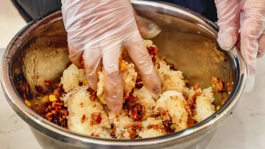 7.倒入煮好的糯米轻轻翻拌,抓至均匀后放凉。