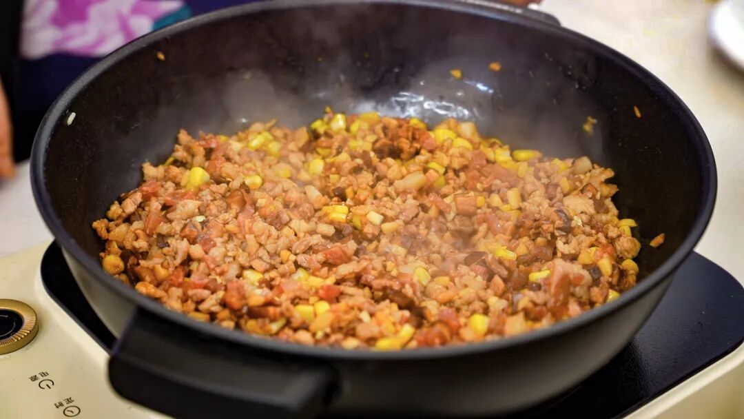 6.油热后,锅中加入肉丁翻炒,变色后加入玉米、笋丁、香肠和香菇丁炒至熟透,加入料酒、老抽、生抽、蚝油等调料。
