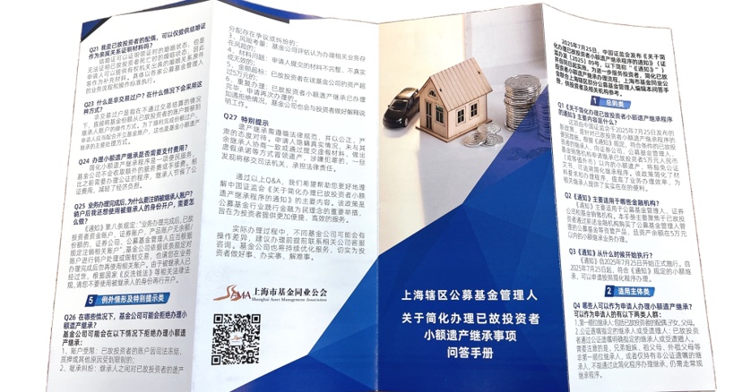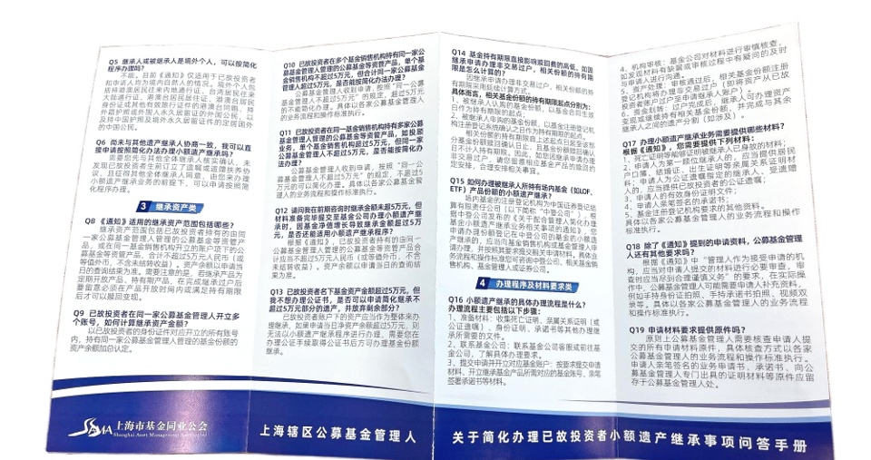 为帮助投资者及相关机构更便捷、更高效地办理小额遗产继承业务,进一步提升基金公司投资者服务质量,上海市基金同业公会联合富国基金、万家基金、永赢基金等上海辖区公募基金管理人共同编制了《关于简化办理已故投资者小额遗产继承事项问答手册》。