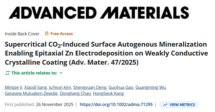 风光等新能源发电存在波动性,大规模储能是其并网的关键。近日,物理科学与工程学院高国华、吴广明团队研究成果发表于《先进材料》(Advanced Materials),并被遴选为封面论文。团队提出了一种基于超临界CO2诱导的自生矿化过程,有效解决了水系锌离子电池的枝晶问题。该方法为高稳定性、高能量密度的锌基储能体系发展开辟了新路径,并为其他金属电极的界面工程提供了普适参考。