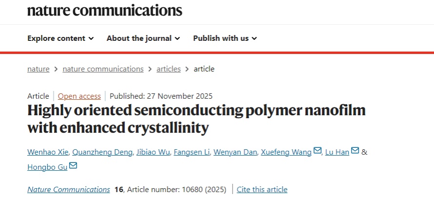高分子半导体材料被广泛应用于柔性可折叠的新型电子器件的制备。近日,化学科学与工程学院谷红波/王雪峰/韩璐团队成果发表于《自然·通讯》(Nature Communications)。该研究制备的半导体高分子纳米薄膜在电子器件的应用中展现出卓越性能,为改进高度有序高分子半导体的制备技术奠定基础,为半导体和芯片行业特别是有机电子器件的设计提供新策略。