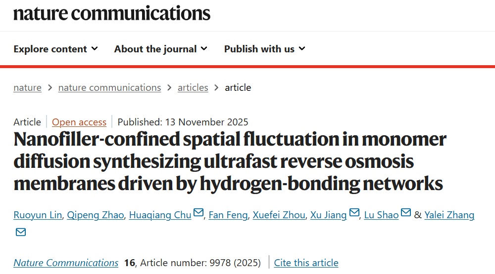 薄膜复合膜是解决全球水资源短缺、实现水资源可持续利用的关键技术之一,但其水渗透性与选择性之间长期存在着“trade-off”效应,严重制约了反渗透技术的能效与规模化应用。近日,环境科学与工程学院张亚雷、褚华强团队成果发表于《自然·通讯》(Nature Communications)。该研究揭示了通过调控单体空间扩散来控制聚酰胺层结构与表面拓扑形貌的新机制,为精确控制界面聚合过程、突破反渗透膜性能瓶颈提供了新的见解和途径。