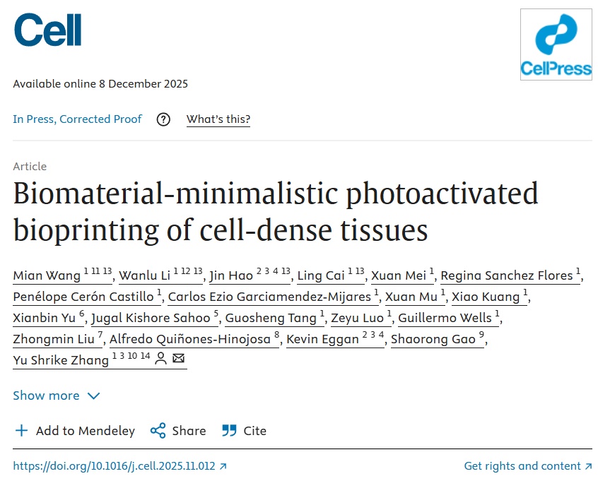 近日,哈佛医学院张宇教授和同济大学生命科学与技术学院高绍荣/王冕团队合作研究成果在《细胞》(Cell)上在线发表,提出了一条反向重构生物打印出发点的技术策略。这是Cell期刊首次发表3D生物打印领域的研究性论文。这项工作通过赋予活细胞以结构构建能力,确立了一条区别于传统材料驱动范式的生物打印新路径,有望在组织修复、疾病建模、器官芯片以及替代动物实验等多个生物医学场景中展现切实的应用潜力。