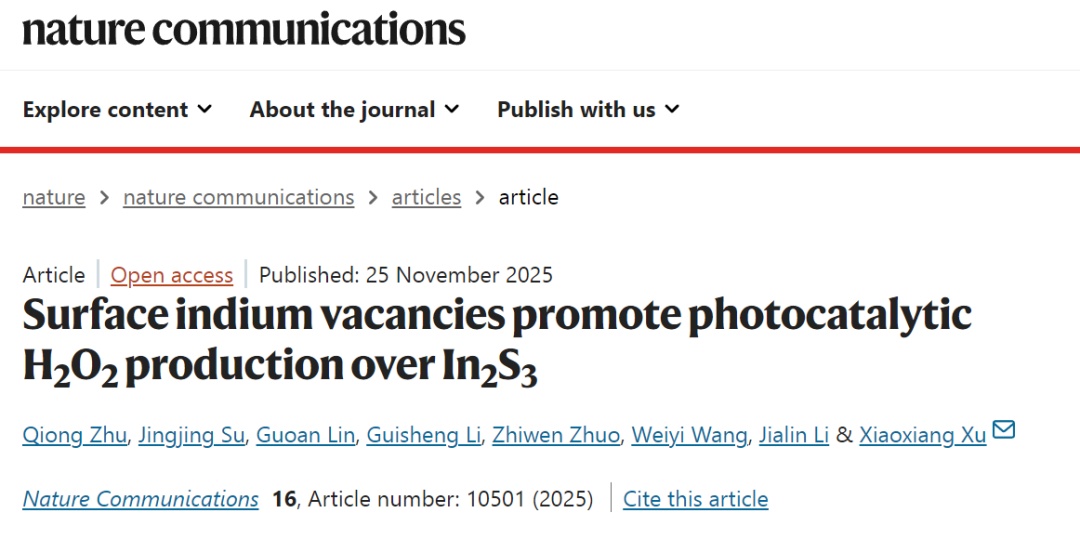 光催化氧还原反应是一种绿色、经济的过氧化氢制备方法。近日,化学科学与工程学院徐晓翔课题组成果发表于《自然·通讯》(Nature Communications)。该研究采用乙二醇作为螯合剂,通过一步水热反应在金属硫化物In2S3表面构建铟离子空位,获得优异的光催化氧还原反应性能,实现可见光驱动的高效光催化合成过氧化氢,为改性金属硫化物光催剂提供了新思路。