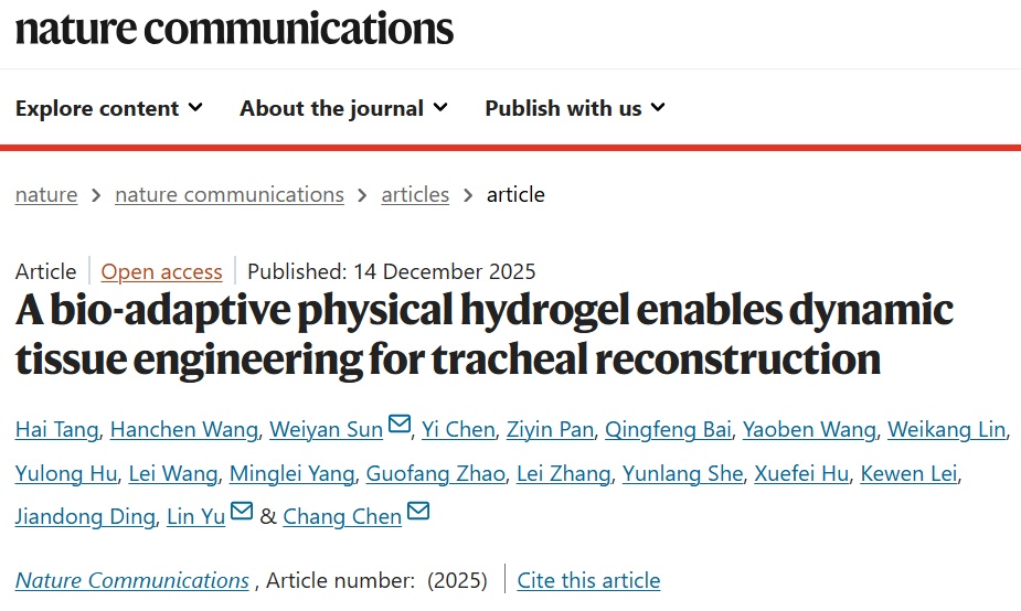 肿瘤切除或先天性疾病导致的长段气管缺损,往往需要同时满足力学支撑、血供重建与气道上皮功能恢复等多重要求。近日,附属上海市肺科医院陈昶团队及其合作团队成果发表于《自然·通讯》(Nature Communications)。该研究系统提出并验证了动态组织工程在气管再生中的关键作用,为长段气管缺损这一长期困扰胸外科与再生医学领域的难题,提供了全新的理论框架与技术路径。