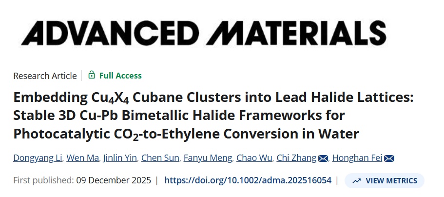 三维铅卤化物因其优异的光电特性,被视为极具潜力的光催化材料。近日,化学科学与工程学院费泓涵课题组联合张弛团队,提出了一种全新的结构设计思路,相关成果发表于《先进材料》(Advanced Materials)。该研究成功构筑了兼具良好水稳定性的三维CuI–PbII双金属卤化物框架材料,并在水体系中实现了CO2向高附加值C2产物乙烯的高选择性光催化转化。