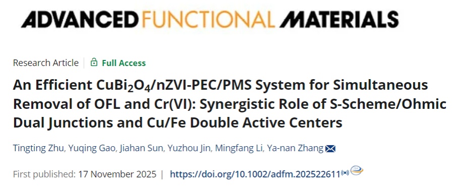 当前,自然环境中的污染物通常不再是单一的有机或重金属污染,难降解抗生素与有毒重金属离子同时存在的现象日益普遍。近日,化学科学与工程学院张亚男团队成果发表于《先进功能材料》(Advanced Functional Materials)。该研究成功制备了先进的CuBi2O4/TiO2光阳极和nZVI/TiO2光阴极,构建了高效的CuBi2O4/nZVI-PEC/PMS体系,实现了对氧氟沙星和六价铬的高效同步去除,为水环境中复合污染物的高效同步去除提供了重要的思路。
