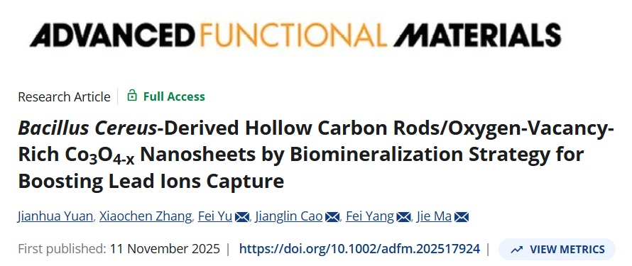 电容去离子技术因其环境友好性、高水回收率以及优异的选择性分离能力,在重金属分离中展现出巨大的应用潜力。近日,环境科学与工程学院马杰团队成果发表于《先进功能材料》(Advanced Functional Materials)。该研究成功构建了一种由中空衍生碳棒(LY)包覆富含氧空位的Co3O4-X纳米片(LY-Co3O4-X)的复合电极材料,呈现出优异的长寿命循环性能,为微生物构建金属氧化物并调控其电化学活性开辟了新途径。