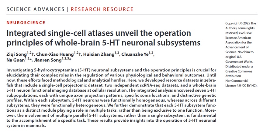 中枢神经系统的5-羟色胺(5-HT)系统神经元功能的高度多样性可能与其错综复杂的全脑投射模式密切相关。近日,医学院、附属上海市第四人民医院宋建人团队成果发表于《科学进展》(Science Advances)。该研究主张将神经元的投射图谱作为分类的基础框架,不仅解析了全脑5-HT神经元系统调控生理和行为状态的运行原理,也为5-HT功能障碍相关疾病的治疗策略提供了新思路。