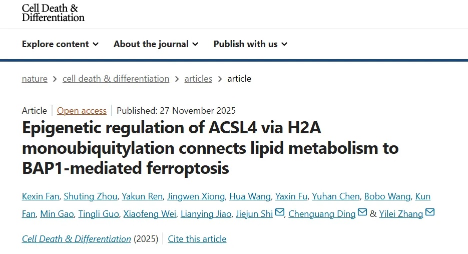近日,团队另一联合研究成果发表于《细胞死亡和分化》(Cell Death & Differentiation),深化了对BAP1调控基因表达和肿瘤抑制功能的理解,也将表观遗传调控、脂代谢重组与铁死亡三个关键生物学过程连接起来,为BAP1相关肿瘤的精准治疗提供了新的代谢干预靶点。