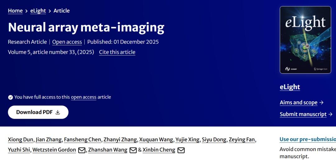 在安防监控、无人机巡检、机器视觉、医学成像和消费电子等领域,对轻小型、高质量成像系统的需求日益迫切。近日,物理科学与工程学院王占山、程鑫彬团队与合作者联合研究成果发表于《光:快讯》(eLight)。该研究提出了一种新的神经阵列成像模型和设计方法,为超透镜轻薄成像系统的实用化发展提供了全新的思路,并为未来实现高性能、紧凑型成像设备提供了解决方案。