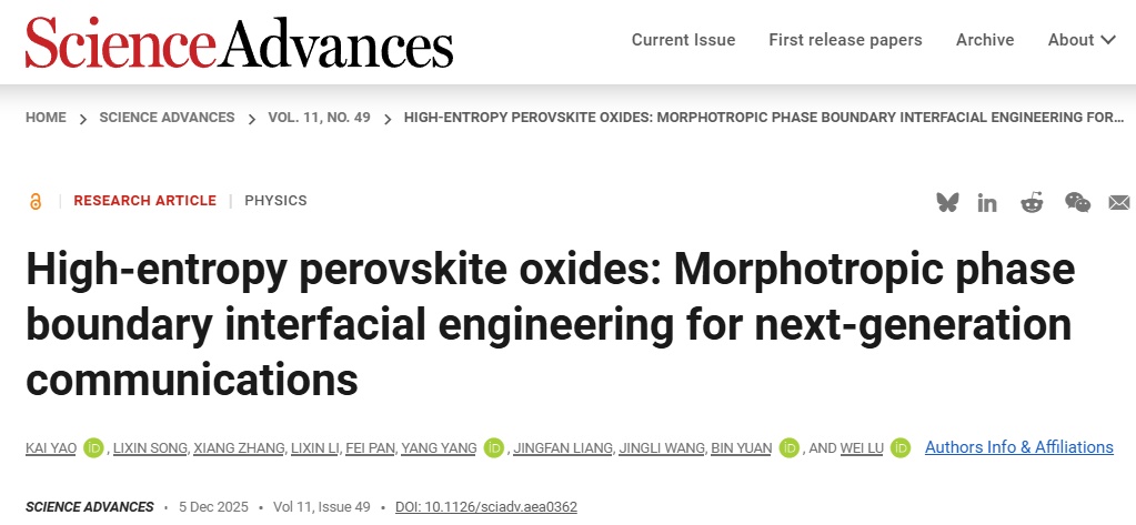 对界面电荷密度和晶格畸变的精确原子级控制仍然是电磁学、光电子学和催化领域的关键挑战。近日,材料科学与工程学院陆伟团队成果发表于《科学进展》(Science Advances)。该研究提出了一种高熵策略并在电磁学中展示了其应用,明确展示了钙钛矿在下一代通信技术中高效低频吸收的可行性,在催化、光子学和能量储存领域展现的广泛潜力。