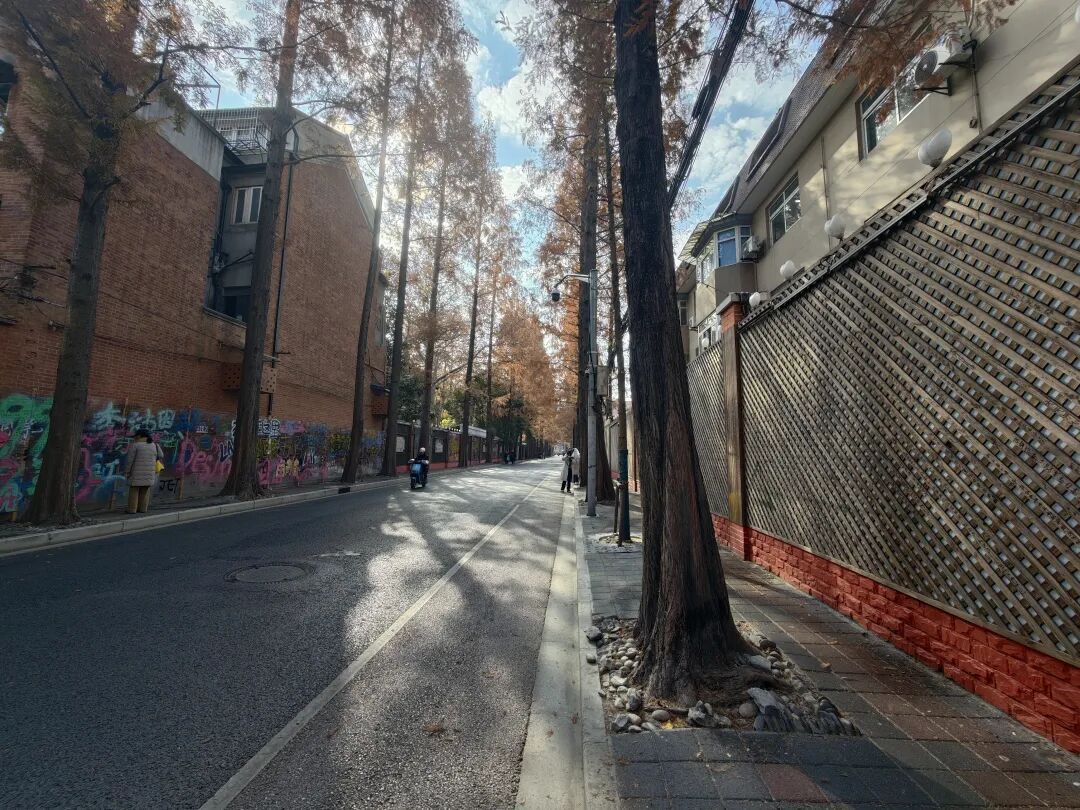 12月19日,阳光透过泛黄的杉树洒进甜爱路,宛如一幅唯美的冬日画卷。