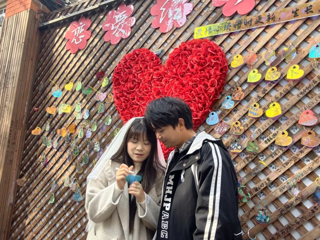 来自宝山罗店的钱先生和朱小姐,在甜爱坊婚姻登记中心领证后,手牵手漫步街头。两年的恋爱长跑,终于在这条最“甜”马路结出硕果。他们在一面写着“恋爱绍介所”的格栅墙前驻足,被各式各样的爱心锁吸引,于是也在专属“爱心锁”上一笔一划写下爱意,郑重将其挂于墙上,把这份甜蜜牢牢锁住。