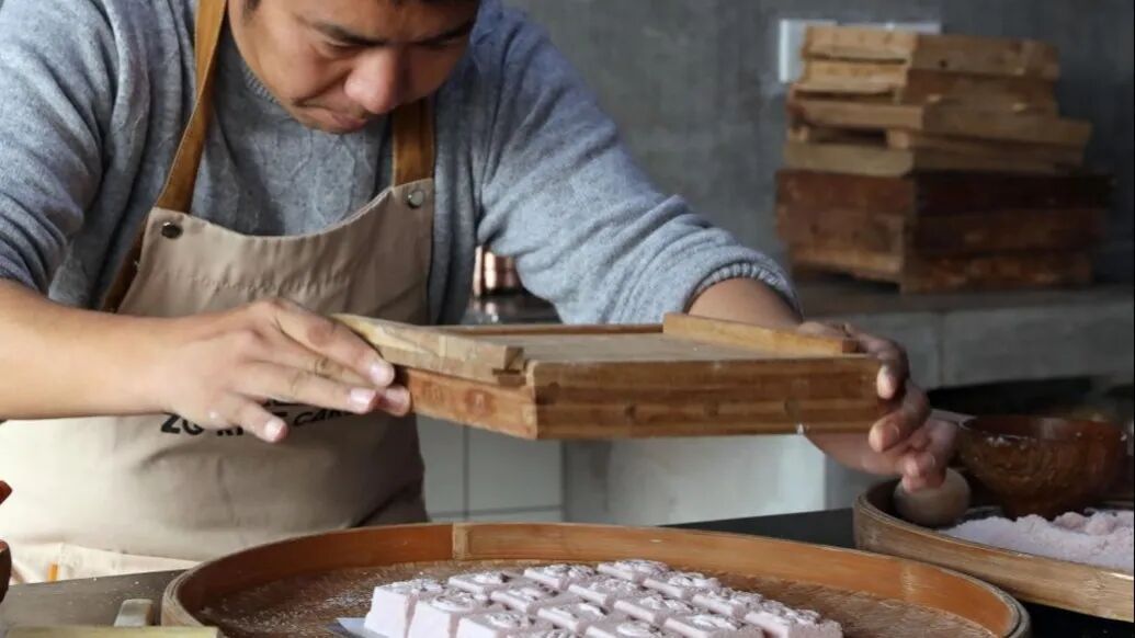 练塘糕团制作技艺是上海市青浦区非物质文化遗产代表性项目之一,焋糕则是练塘糕团的最典型代表。糯米粉和粳米粉混合,经过磨粉、溲粉、制馅、装模、焋打、熏蒸等工序,一口“糯叽叽”就诞生了。