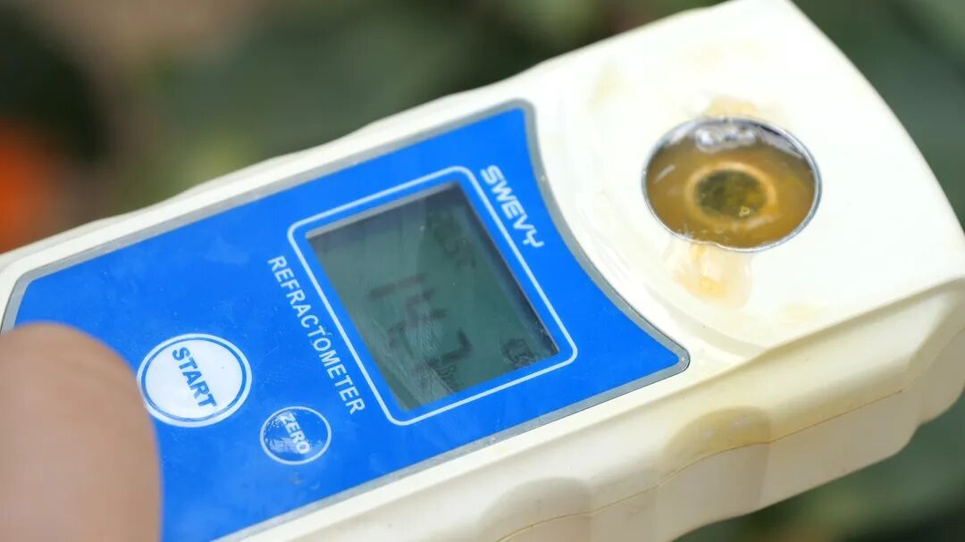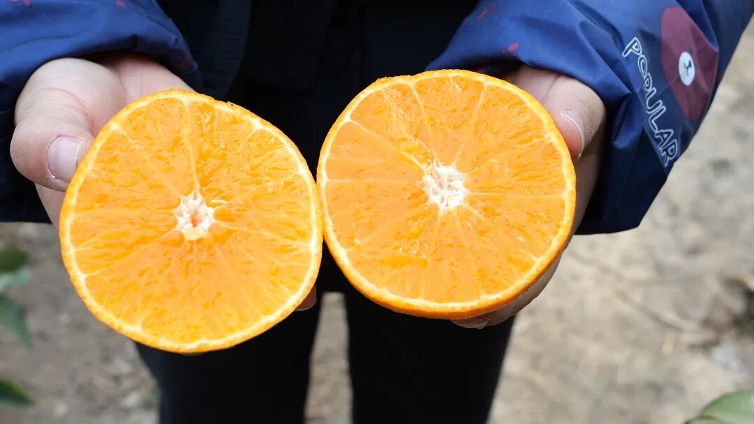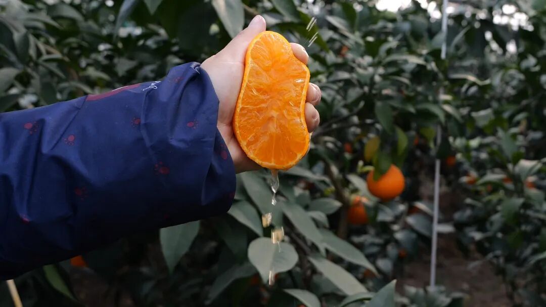 合作社负责人金霏妃现场摘下一颗饱满的“红美人”,切开后,柑橘清香扑鼻,稍加挤压,晶莹的果肉立刻“爆汁”。经糖度仪检测,这颗果实的甜度已达到14.7,比一个月前明显提升。