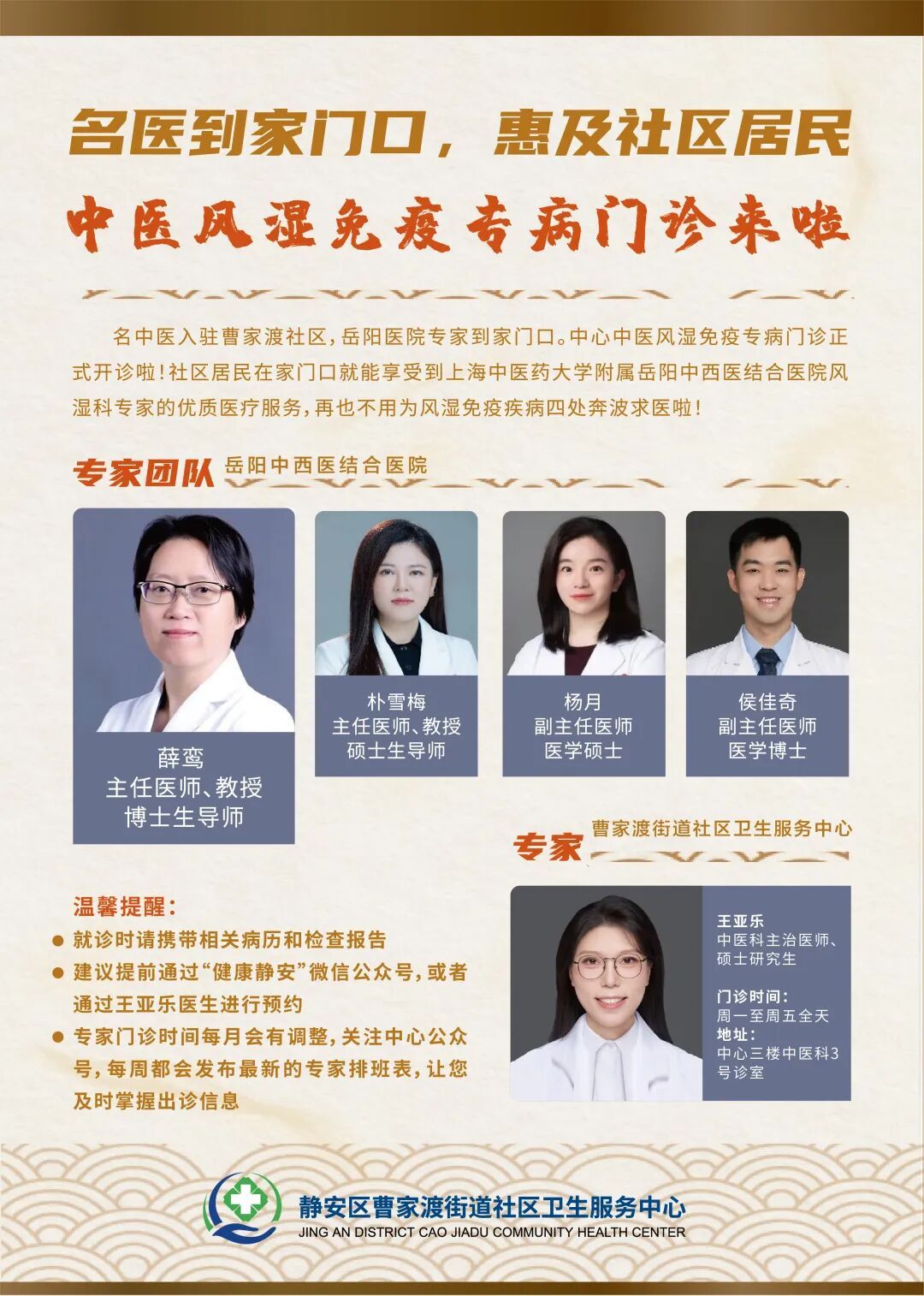 近日,曹家渡街道社区卫生服务中心传来好消息:上海中医药大学附属岳阳中西医结合医院风湿科主任薛鸾主任医师团队正式入驻,开设“中医风湿免疫专病门诊”,让居民在“家门口”就能享受三甲医院专家的中西医结合诊疗服务。
