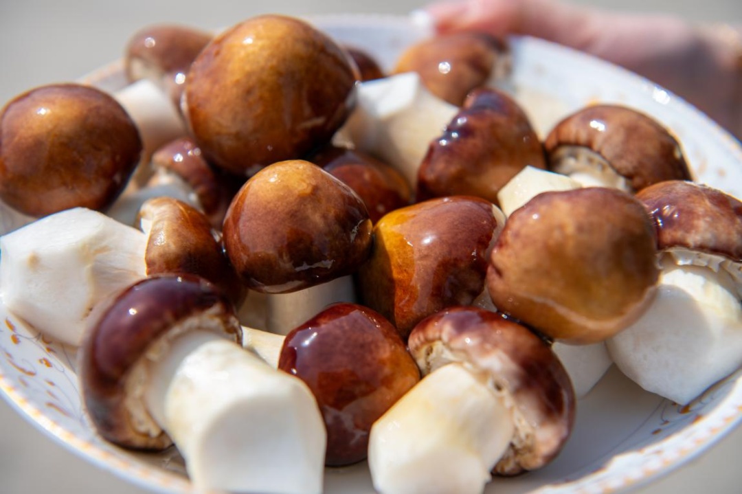 采摘出土的小菌菇个个新鲜饱满,为了让游客们品尝到独一份的“鲜美”,基地还推出了“现摘鲜食”服务。蘑菇只需简单清洗后,去除菌菇杆及伞盖上的尘土即可烹饪食用。现摘的菌菇口感鲜嫩,最大限度地保留着菌菇本身的清香。赤松茸香气浓郁,口感滑嫩。香菇肉质厚实,味道鲜美,营养价值极高。