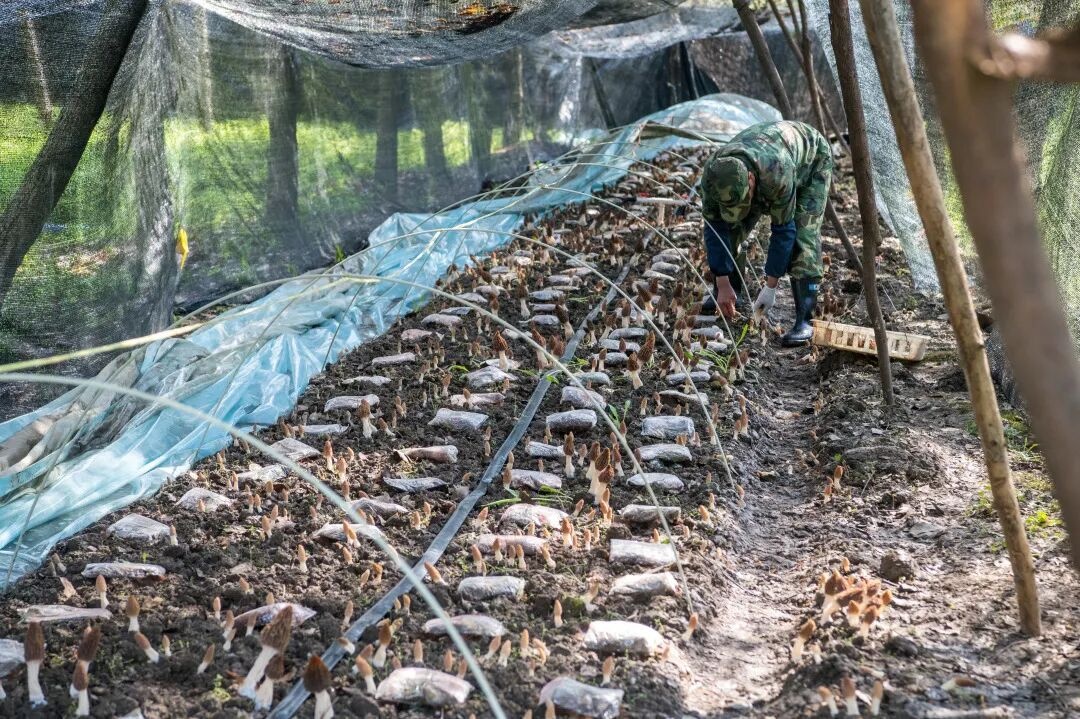 一排排百米长的遮阳小棚在护塘村生态林整齐排列,工人们逐个掀起薄膜,寻找新鲜的赤松茸。而在一旁的遮阳大棚内,有着“菌中之王”美誉的羊肚菌也破土而出,长势喜人。工人们戴上手套,小心翼翼地采摘。合作社负责人黄铭亭告诉记者,在林下种植菌菇不仅能充分利用林下空间,还能反哺林地。