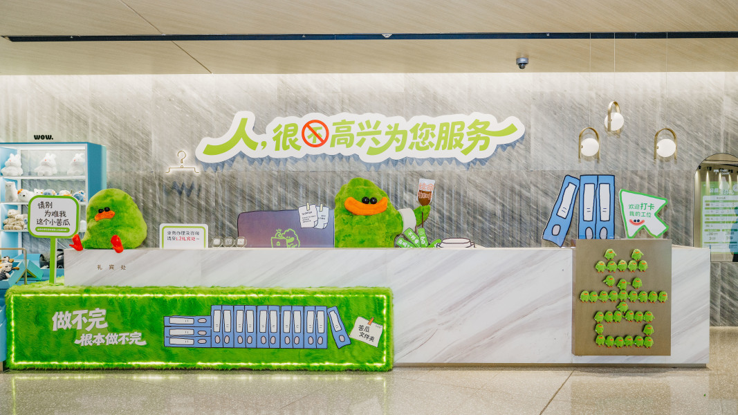 展览围绕“治愈感”与“趣味感”展开设计。从户外广场的表情包合集装置、L1入口的“不高兴”服务台,到中庭“苦瓜不苦”毛绒包柱,六大场景贯穿商场动线,构建出一个可打卡、可沉浸的“情绪现场”。