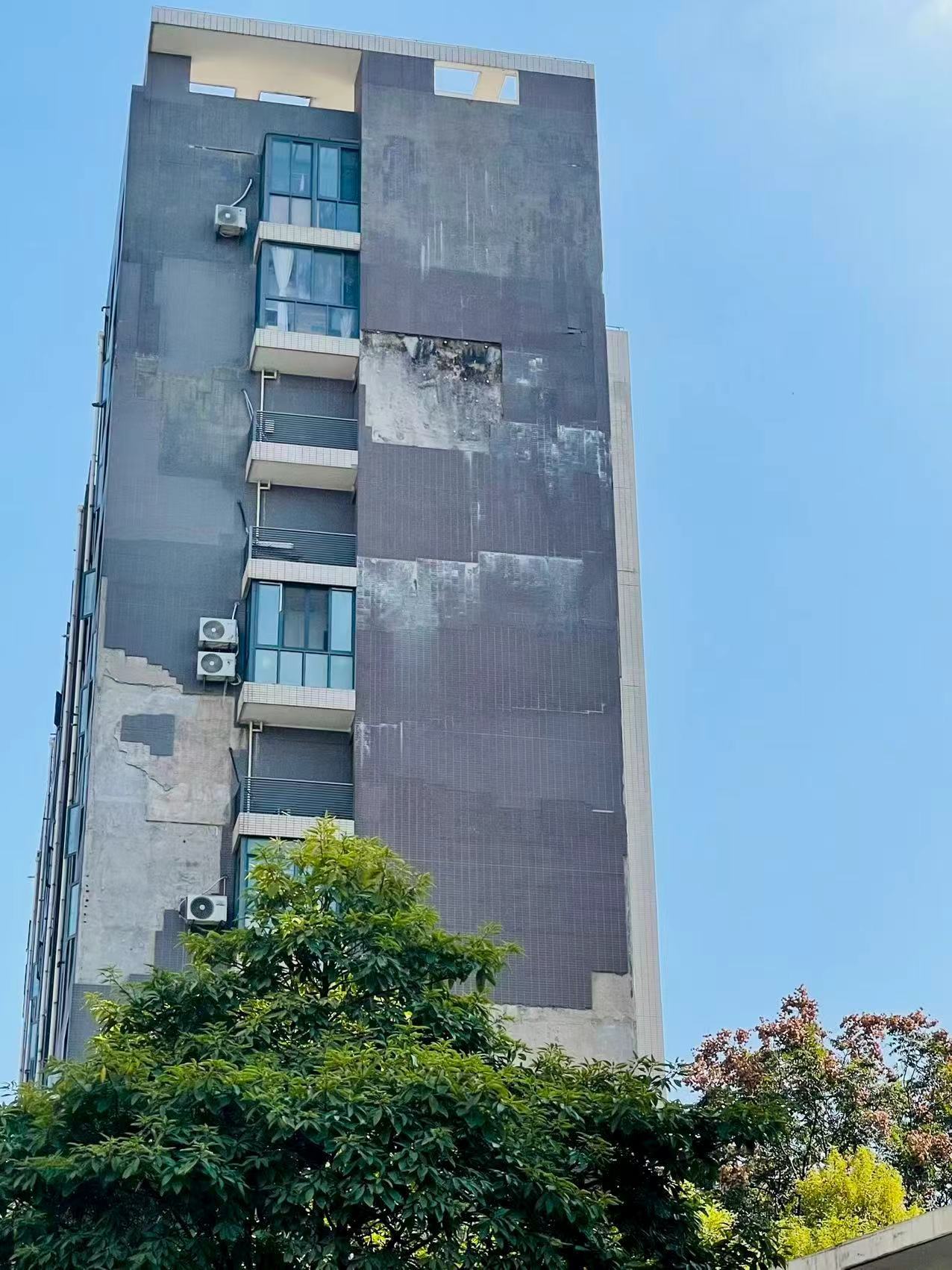 奥园是松江区典型的万人聚居社区,共有164个自然楼栋,建筑面积达75万平方米,居住近1.8万人。因开发周期跨度大,不同楼栋房龄差异明显。其中,三期楼栋早在2010年便陆续出现外墙保温材料开裂、空鼓现象,部分区域甚至发生小块脱落,不仅让楼栋外观变得“斑驳破旧”,也给楼下散步的老人、玩耍的孩子及停放的车辆带来安全风险。