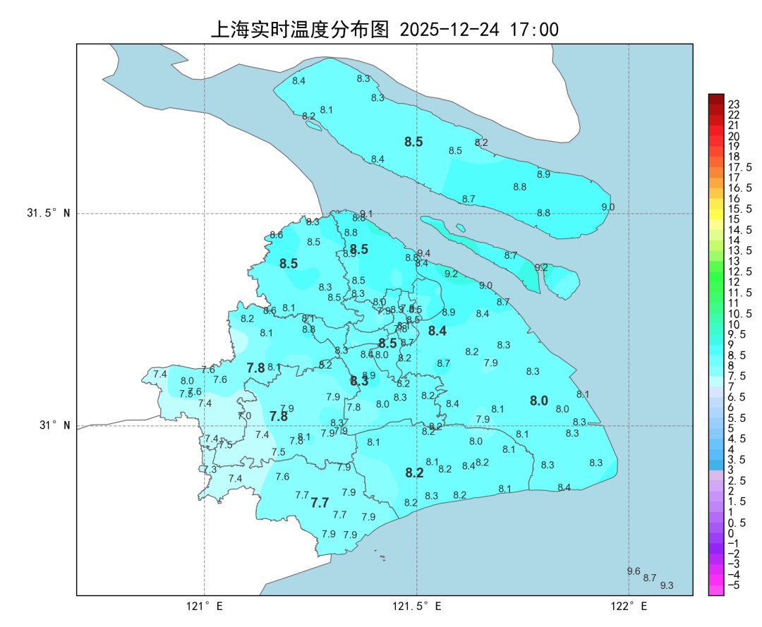 受冷空气影响,上海今天普降小雨。昨天20时到今天16时雨量统计显示,金山吕巷镇4.5毫米为最大。全天温差小,市区徐家汇站白天(8~17时)最高气温仅9.3℃,最低气温8.5℃。预计今天夜里逐渐雨止多云。