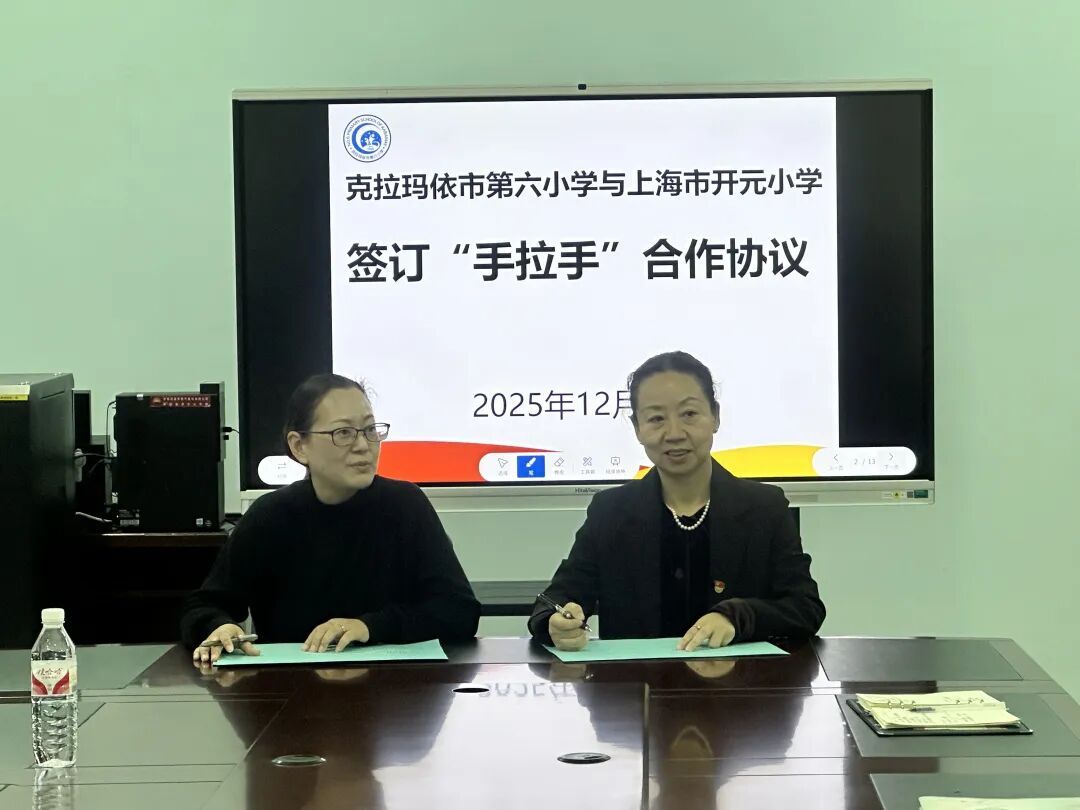 近日,在上海市援克前指的协调支持下,克拉玛依市第六小学与上海市长宁区开元小学正式签订“手拉手”合作协议,联结油城与沪上的教育初心,开启两校协同发展的崭新篇章。克拉玛依区教育局副局长(援疆)王浩峰参加签约仪式。