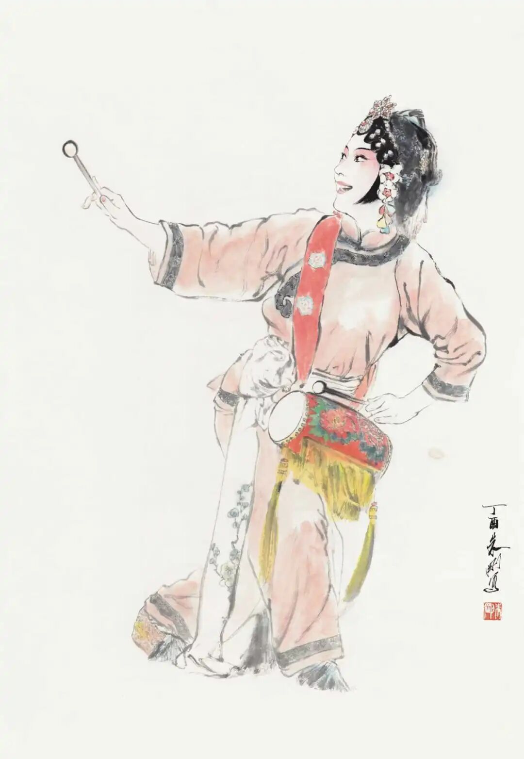 朱刚的戏曲人物作品聚焦于人物神态,尤其精于眼神刻画,面部描绘细腻传神,服饰则在保持程式准确的前提下适度概括。这种“突出重点”的手法,结合对舞台构图的主观提炼,使其作品超越了单纯的叙事,更具情感张力。