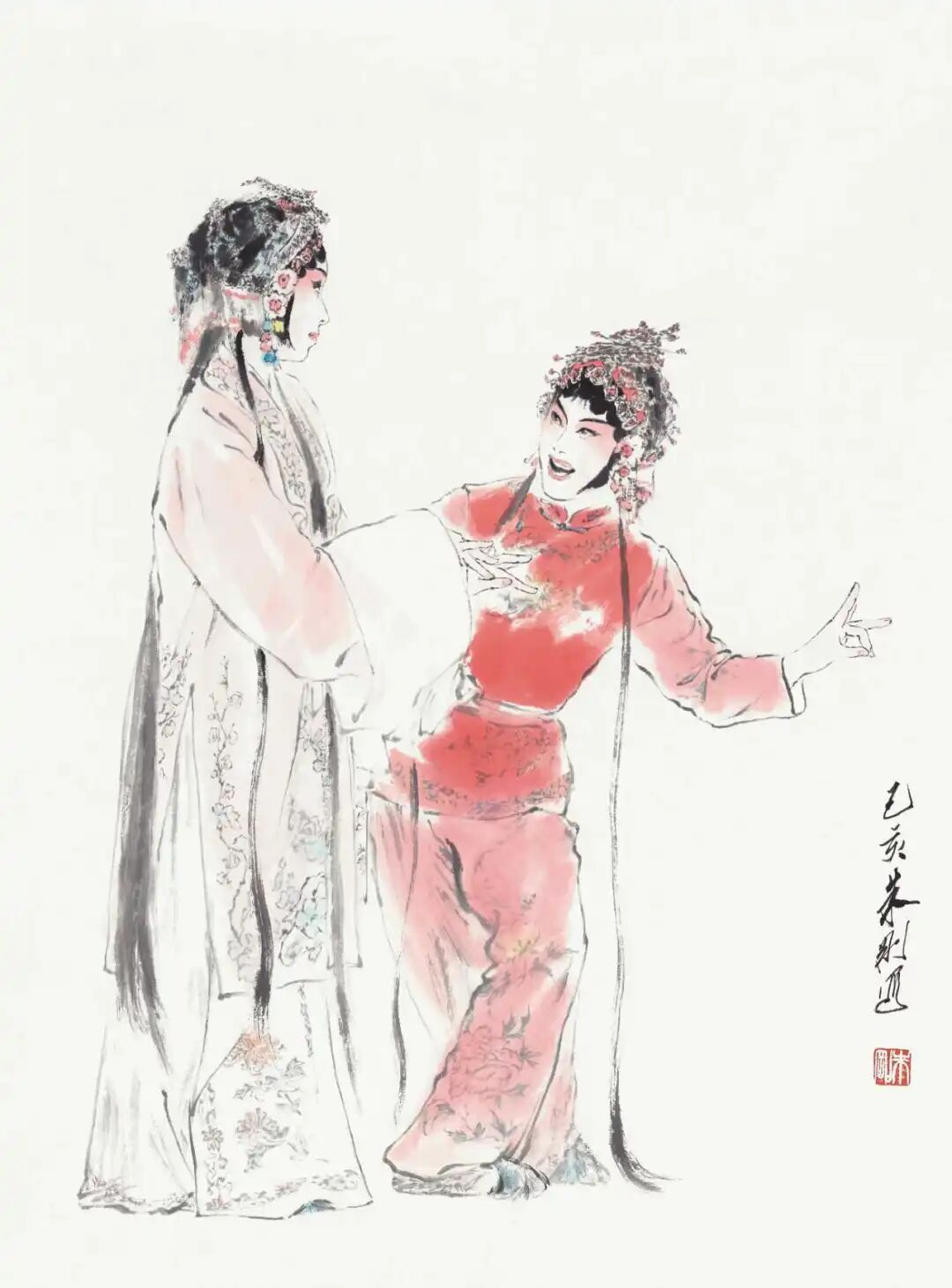 朱刚的戏曲人物画创作始于上世纪80年代的一次“无心插柳”。当时在出版社担任美术编辑的他,为打破音像制品封面多为港台歌星大头照的单调格局,尝试为越剧《红楼梦》磁带绘制了水墨风格的贾宝玉与林黛玉画像。这幅作品不仅获得了同事的认可,更打动了徐玉兰、王文娟等表演艺术家,这份来自戏曲界的首肯,为他埋下了创作的种子。