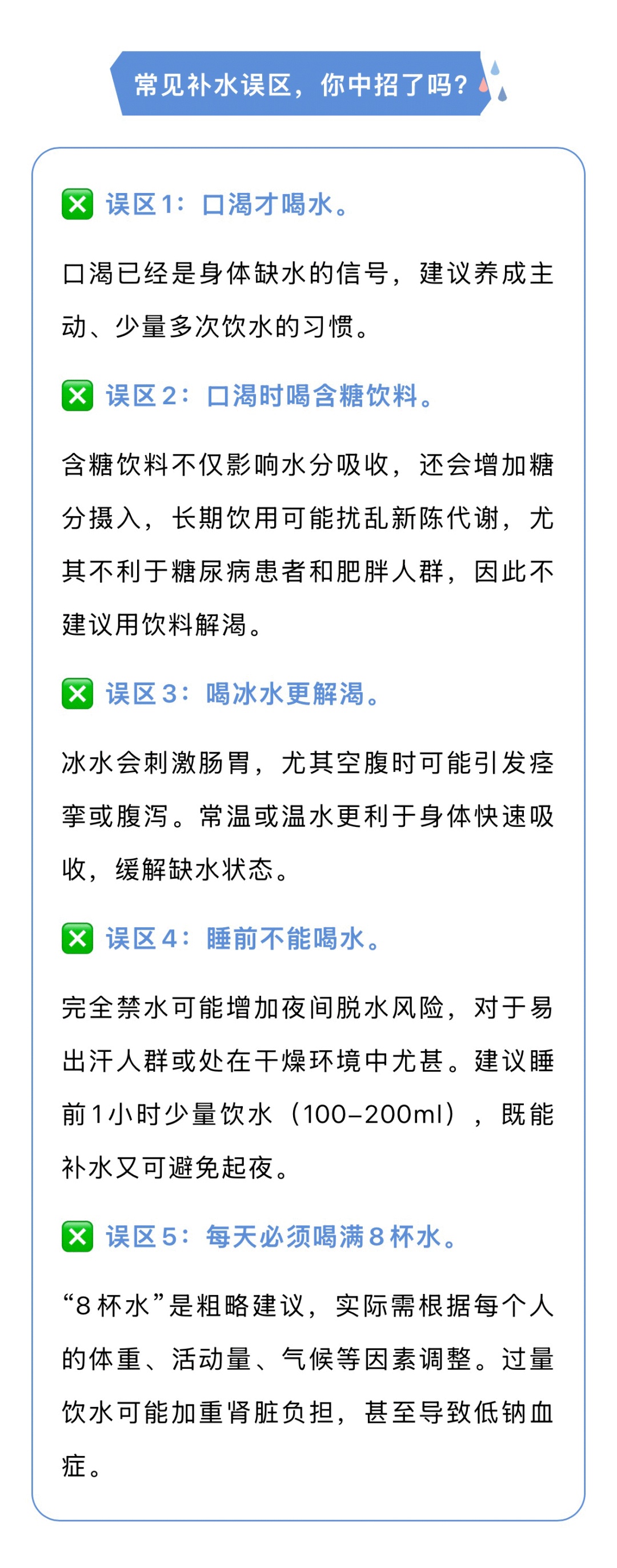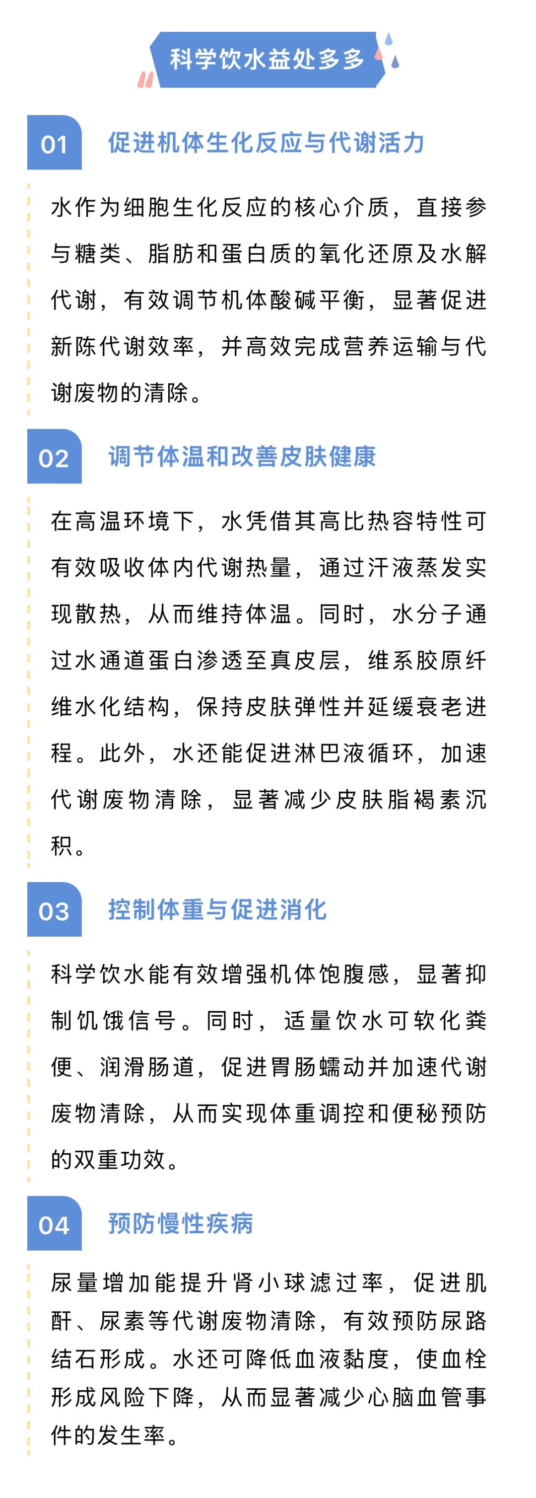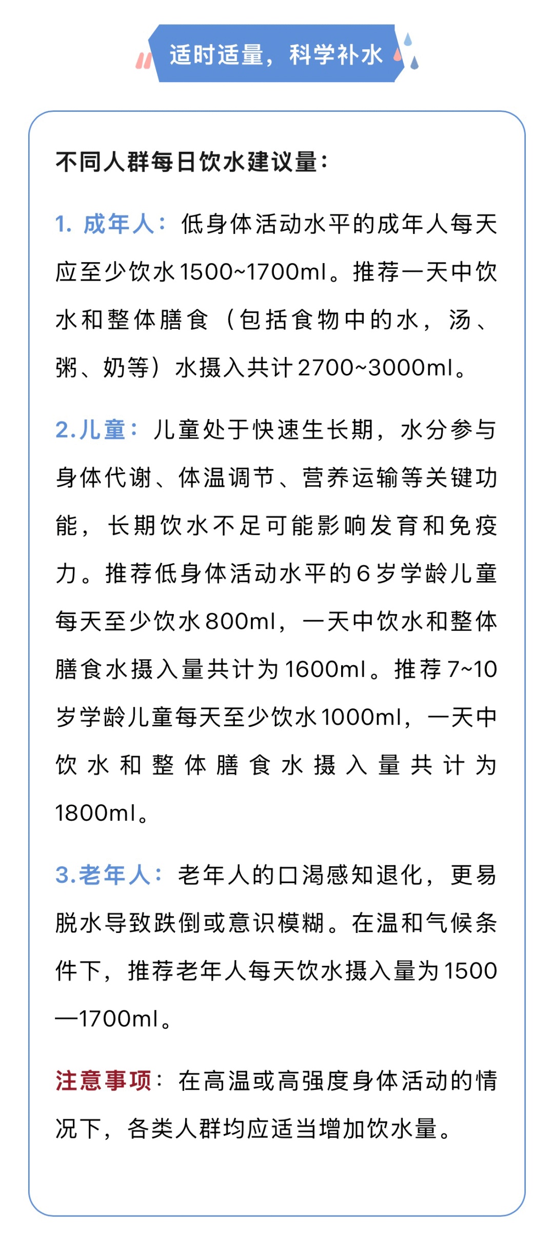 水是维持生命活动的基础介质,作为人体最主要的组成成分,约占体重的60%~70%。市疾控中心介绍,科学合理的饮水能够保障基础代谢稳定和生理功能平衡,促进各组织器官正常运作;反之,若长期饮水不足,将导致多系统功能紊乱,甚至诱发多种慢性疾病的发生发展。补水有哪些常见误区?不同人群每日饮水建议量多少?详见↓