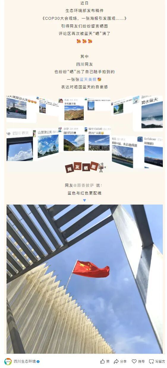 11月,第30届联合国气候变化大会(COP30)在巴西贝伦召开,境内外媒体围绕大会积极开展宣传,其中中央广播电视总台微信视频号“玉渊谭天”视频作品《COP30大会现场,一张海报引发围观……》以独特的视角、“以小见大”的叙事结构和正向的价值输出讲述了“中国的天空需要被重新认识”的故事,引发了网友情感共鸣。各地政务新媒体账号抓住契机,纷纷转发该视频作品,“四川生态环境”通过发布网友“拍蓝天”晒图进一步扩大宣传效果。此外,围绕COP30大会,“云南省生态环境厅”发布文章《从愿景到现实,云南经验在COP30中国角主题边会上引关注》,分享生态治理经验;“海南生态环境”以《海南亮相COP30中国角 全球分享热带岛屿绿色转型“中国方案”》为题,展现热带岛屿绿色发展的海南实践;“黑龙江生态环境”推出《COP30:黑龙江省在世界舞台展示低碳发展实践与成果》,亮出地方低碳发展成绩单。
