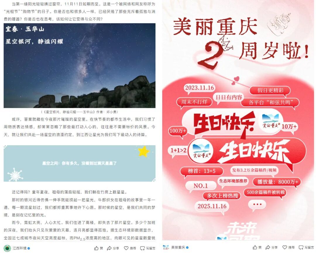 “江西环境”推文《“我能想到最浪漫的事,就是陪你到江西看星星”》运用了大量生动的比喻和细腻的场景描写,邀约公众来一场星空之约。该文以诗意的表达,娓娓道来诉说星空的浪漫,构建了强烈的画面感和沉浸感。文章“寓情于景”又“借物说理”,以“PM2.5平均浓度27微克/立方米”“空气优良天数比率95.5%”的数据揭秘澄澈星空的原因,也呼吁大家践行在发展中守护环境、在喧嚣中保有宁静的现代文明生活方式,让仰望星空的诗意情怀找到了“随手关灯”“垃圾分类”等现实生活的落脚点。文章阅读量超10万+。
