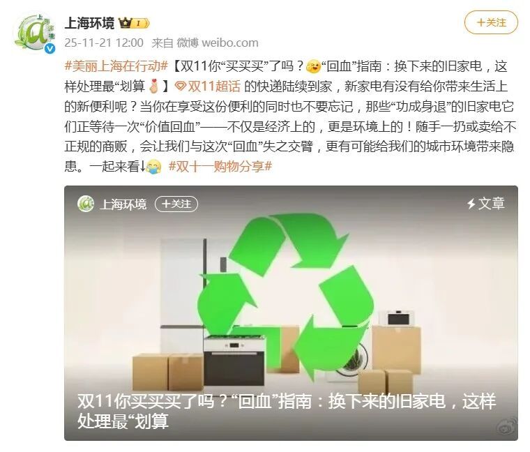@上海环境以“双11”购物热潮为切入点,精准捕捉了消费者换新家电后旧家电处理的普遍需求,既贴合热点又切中实际痛点。