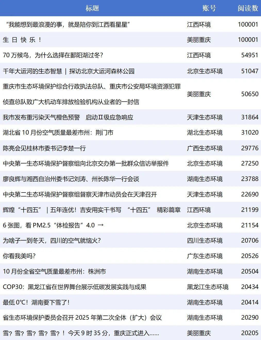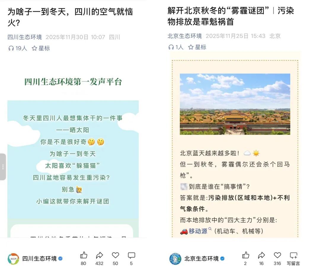 “四川生态环境”文章《为啥子一到冬天,四川的空气就恼火》精准解答了四川盆地冬季大气污染的核心谜团,兼具科普专业性与本土传播适配性。湖北、天津、湖南等官方账号的多篇文章聚焦空气质量状况,受到关注。
