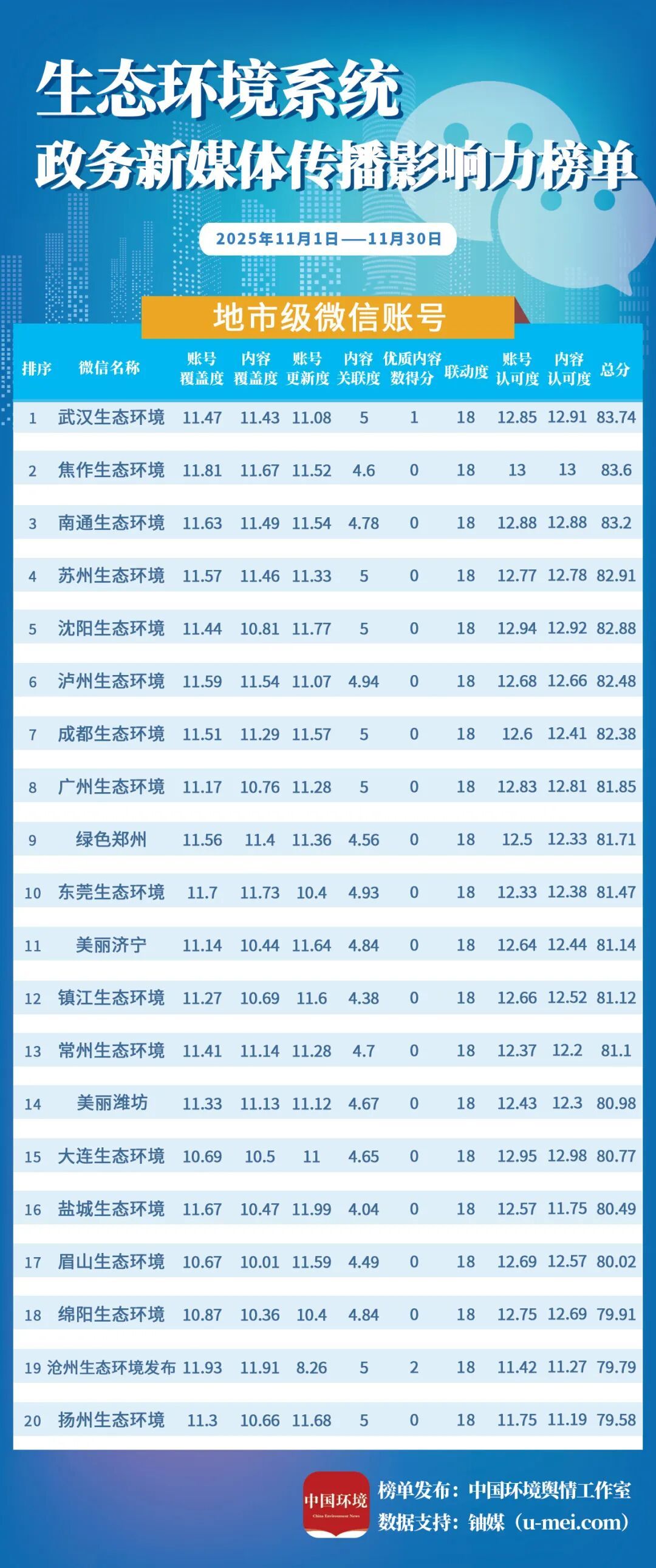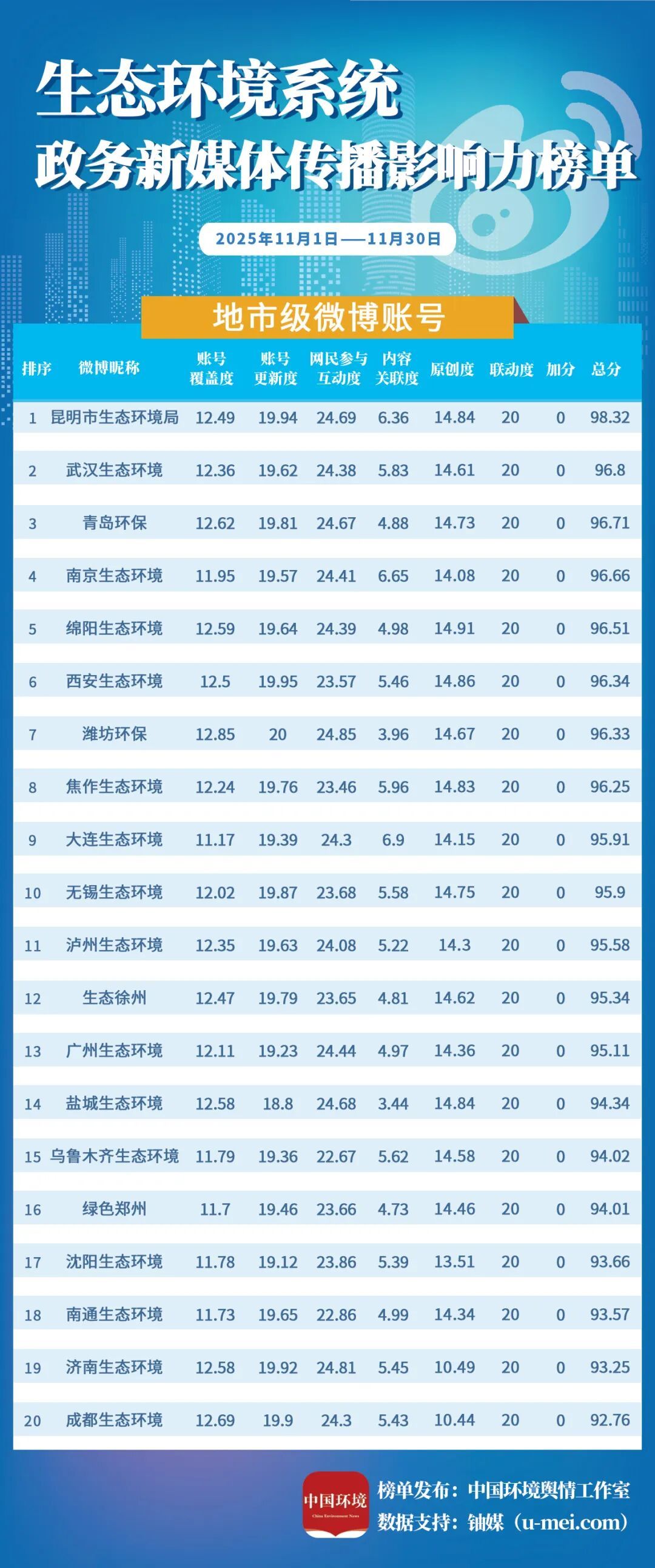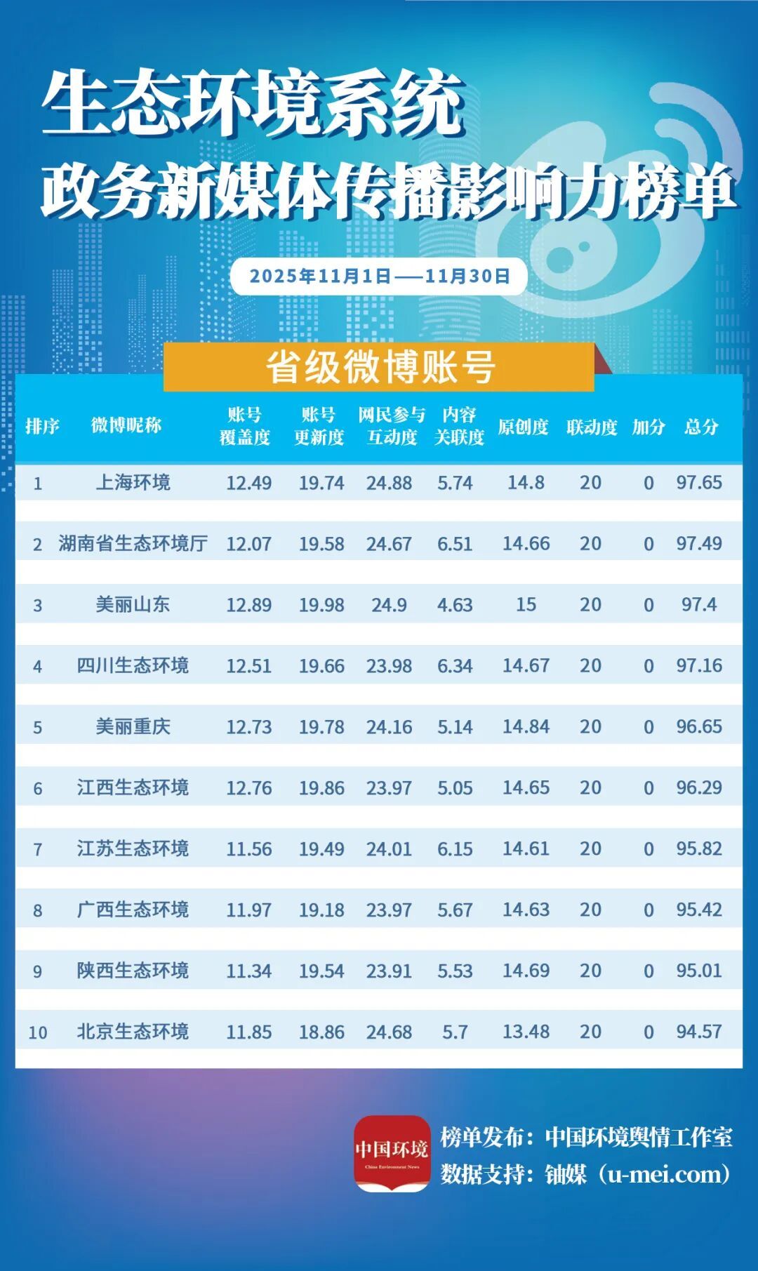 为进一步推动生态环境系统政务新媒体持续健康发展,更好发挥信息公开、舆论引导、社会治理、凝聚共识等作用,中国环境报社、中国环境客户端日前发布11月全国生态环境系统政务新媒体传播影响力榜单。