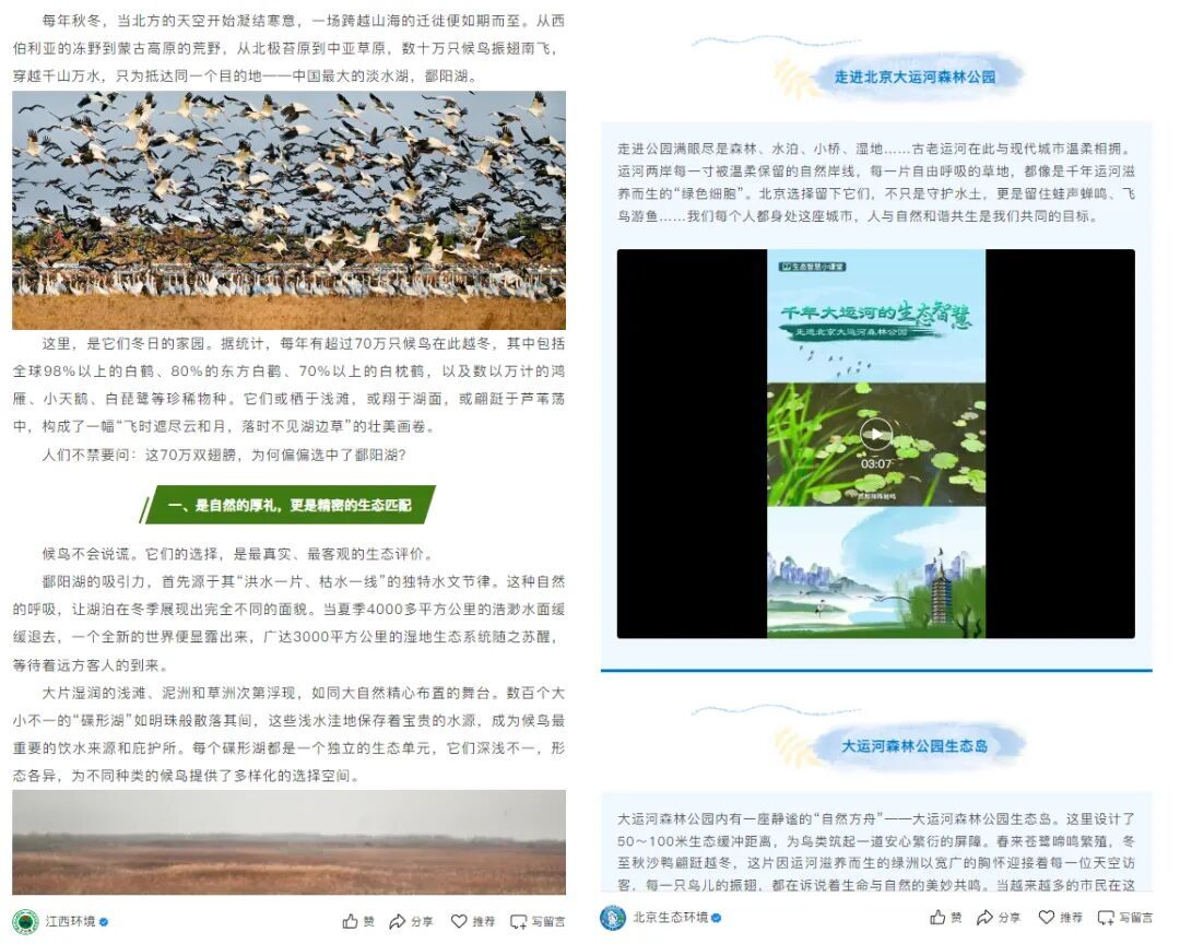 “江西环境”文章以“70万候鸟为何选中鄱阳湖”设问,用“飞时遮尽云和月,落时不见湖边草”的诗句勾勒壮美场景,随后从“洪水一片、枯水一线”的独特水文节律、适宜气候、区位优势等进行介绍,凸显其作为候鸟越冬地的生态优势。通过介绍退田还湖、十年禁渔、社区共管等治理举措,体现生态保护成效。