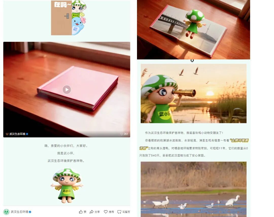 地市级微信账号方面,“武汉生态环境”推文《武小环带你遇见美丽武汉》以吉祥物“武小环”的口吻,打开一组组“生态相册”,将曾经东湖薄雾笼罩、长江大桥轮廓模糊的场景和如今的崭新面貌进行对比,展现了城市的生态蜕变。“南通生态环境”文章《以为是肯尼亚,原来是南通如东》,以摄影师航拍的如东麋鹿群展开,凸显当地生态环境保护成效。