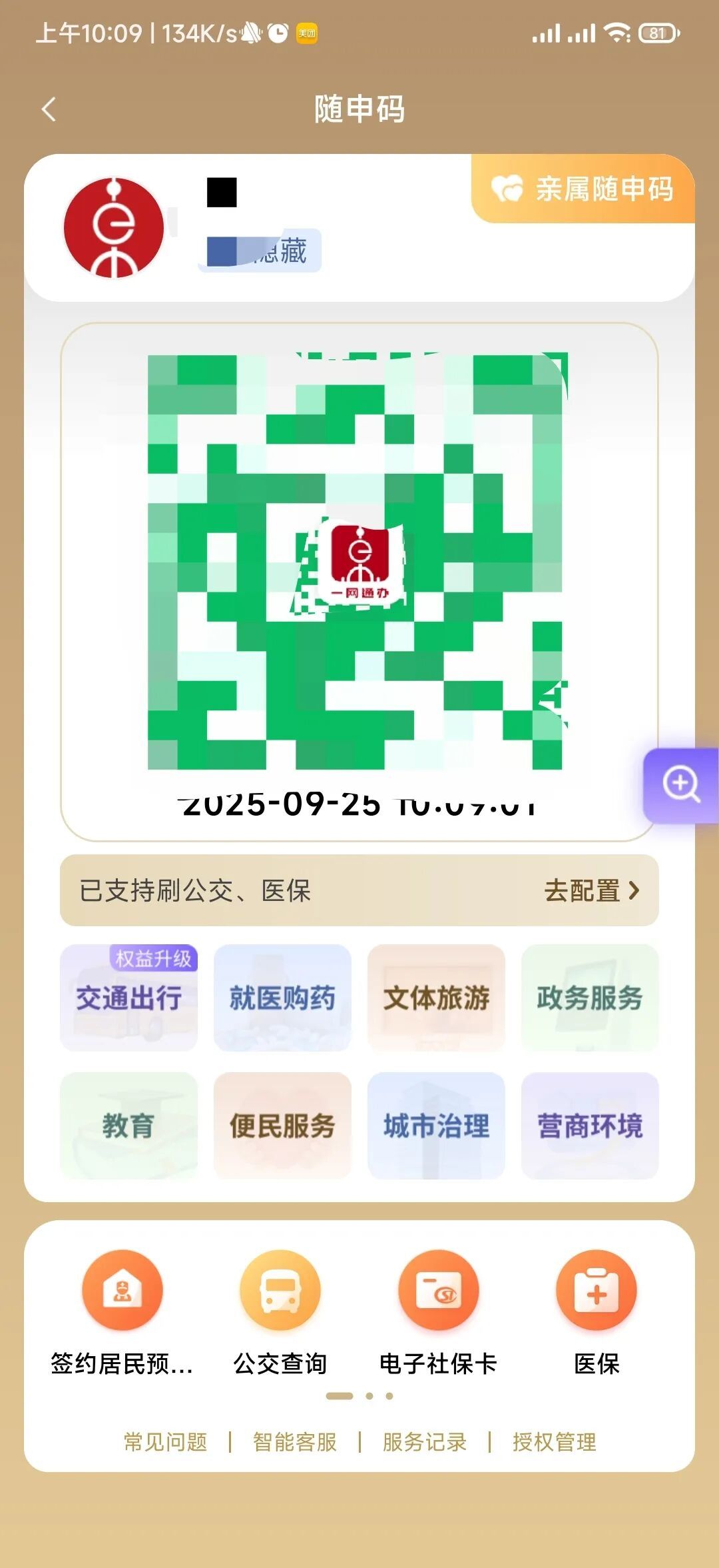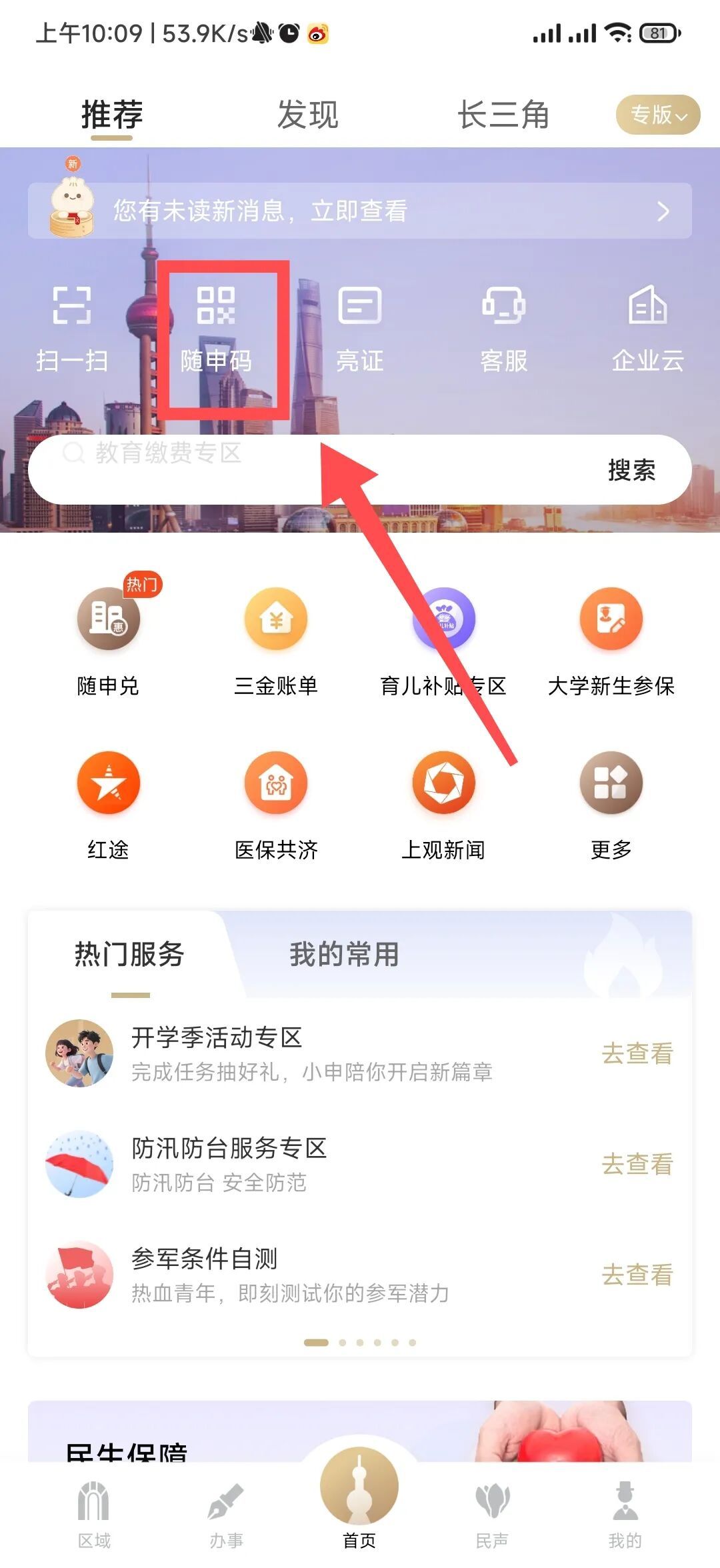 打开“随申办市民云”(APP/微信小程序/支付宝小程序),点击首页“随申码”完成“随申码”交通场景配置,全市公交、地铁、轮渡一码畅行~