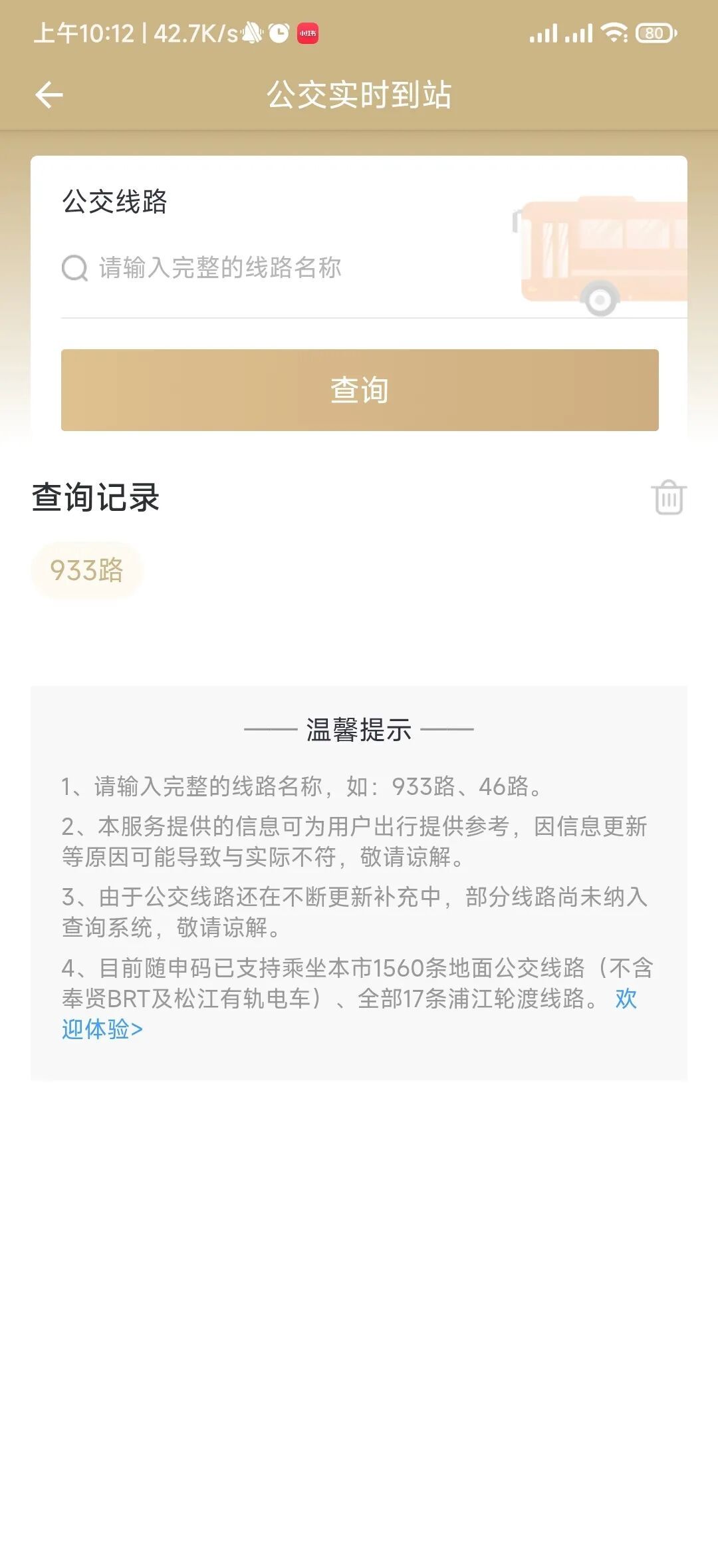 进入查询页面后,输入想要查询的完整线路名称,进入线路页面后选择您想查询的站点,就可以找到相应的车辆牌号,查看到站时间。